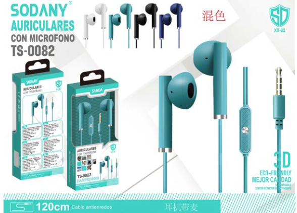 In-ear headphones with built-in microphone, available in a variety of colors (black, white, red, blue and green). Designed to offer excellent sound quality and comfort, ideal for calls and listening to music.