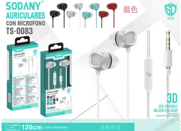 In-ear headphones with built-in microphone, available in a variety of colors (black, white, red, blue and green). Designed to offer excellent sound quality and comfort, ideal for calls and listening to music.