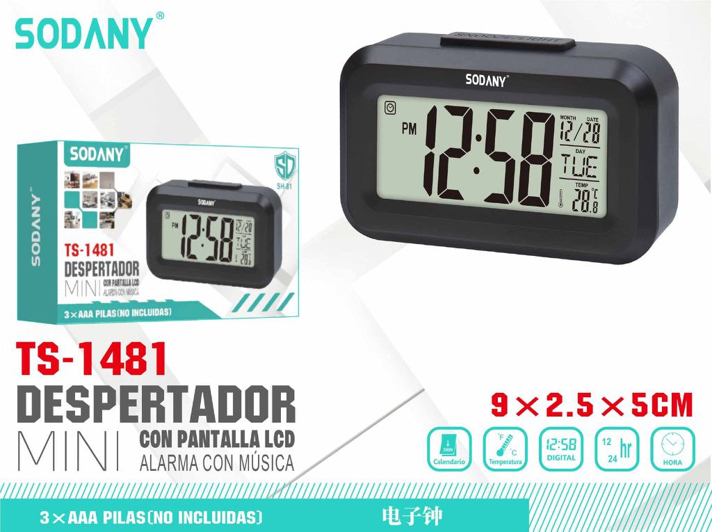 The Sodany TS-1481 is a compact electronic alarm clock designed to offer the essential functionality of an alarm clock with a clear LCD display and a music alarm.