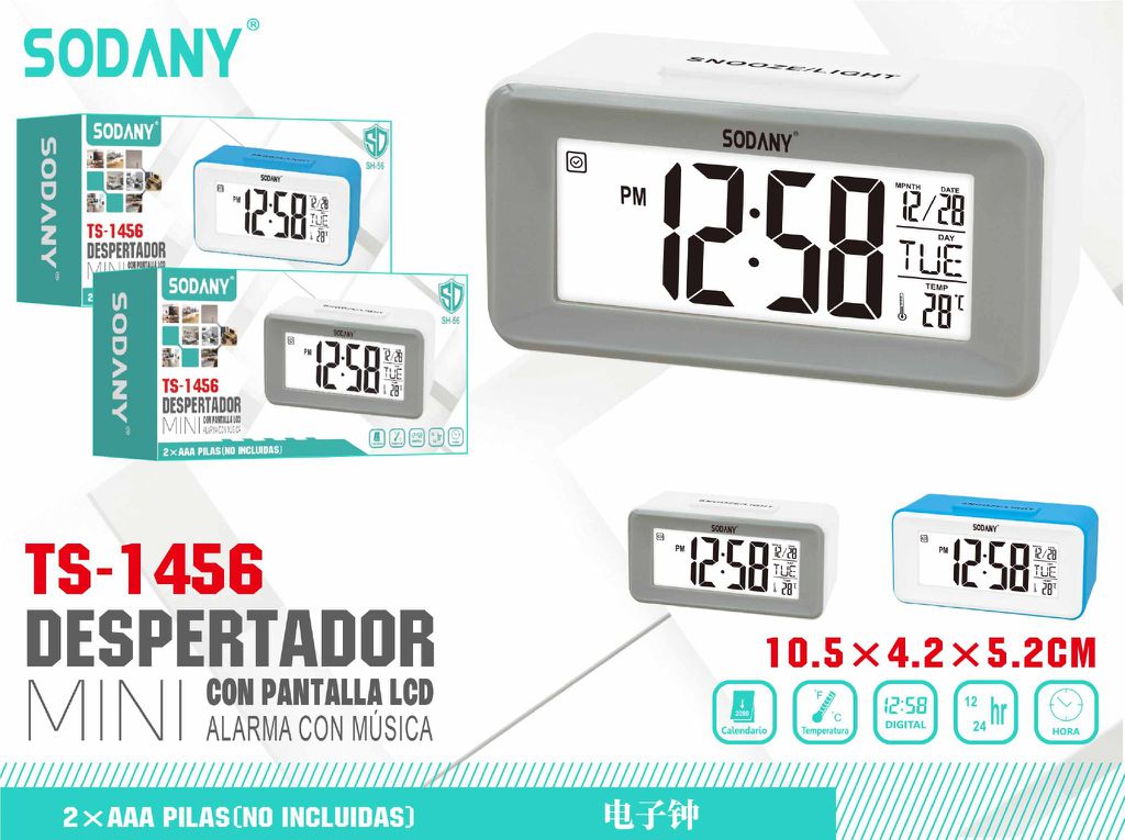 The Sodany TS-1456 is a compact and functional digital alarm clock, designed to offer an efficient start to your day with its clear LCD display and advanced features. Its small size makes it ideal for any space.