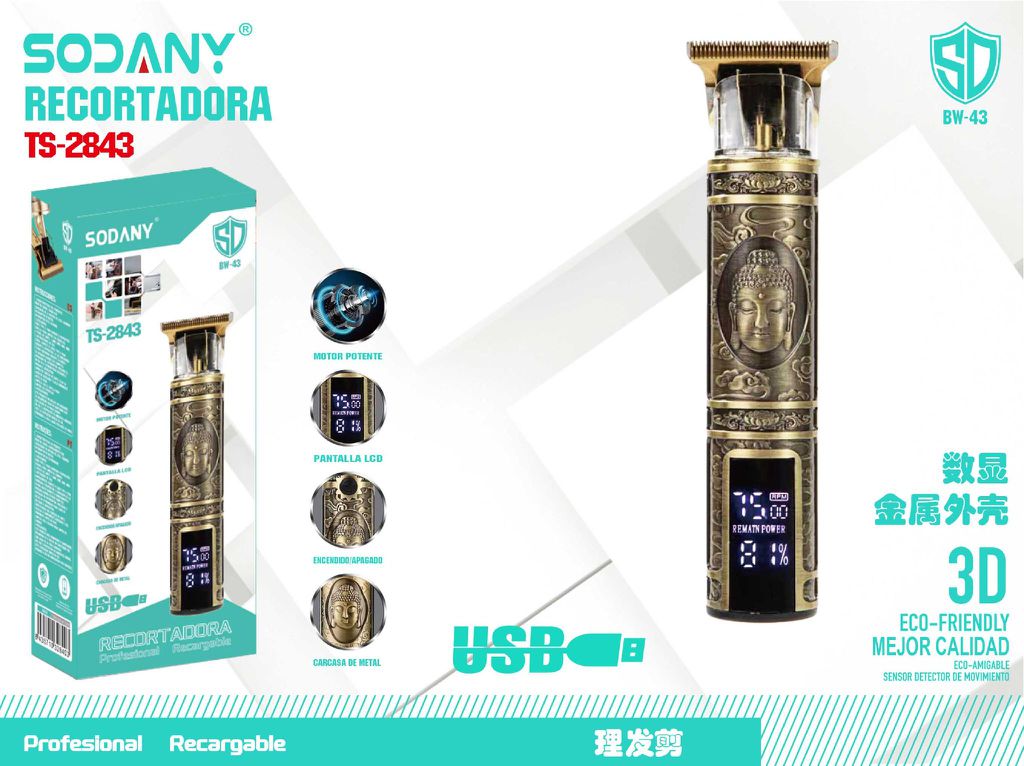 Descripción del Producto: Recortadora de cabello profesional recargable SODANY, modelo TS-2843. Presenta un diseño distintivo con un cuerpo grabado en color bronce, una cabeza de corte metálica y una pantalla LCD avanzada que muestra el porcentaje de batería restante (ej. "81%") y el tiempo de uso restante (ej. "75 MIN REMAIN POWER"). Equipada con un motor potente y fabricada con una robusta carcasa de metal 3D Eco-Amigable. Se carga fácilmente mediante USB.