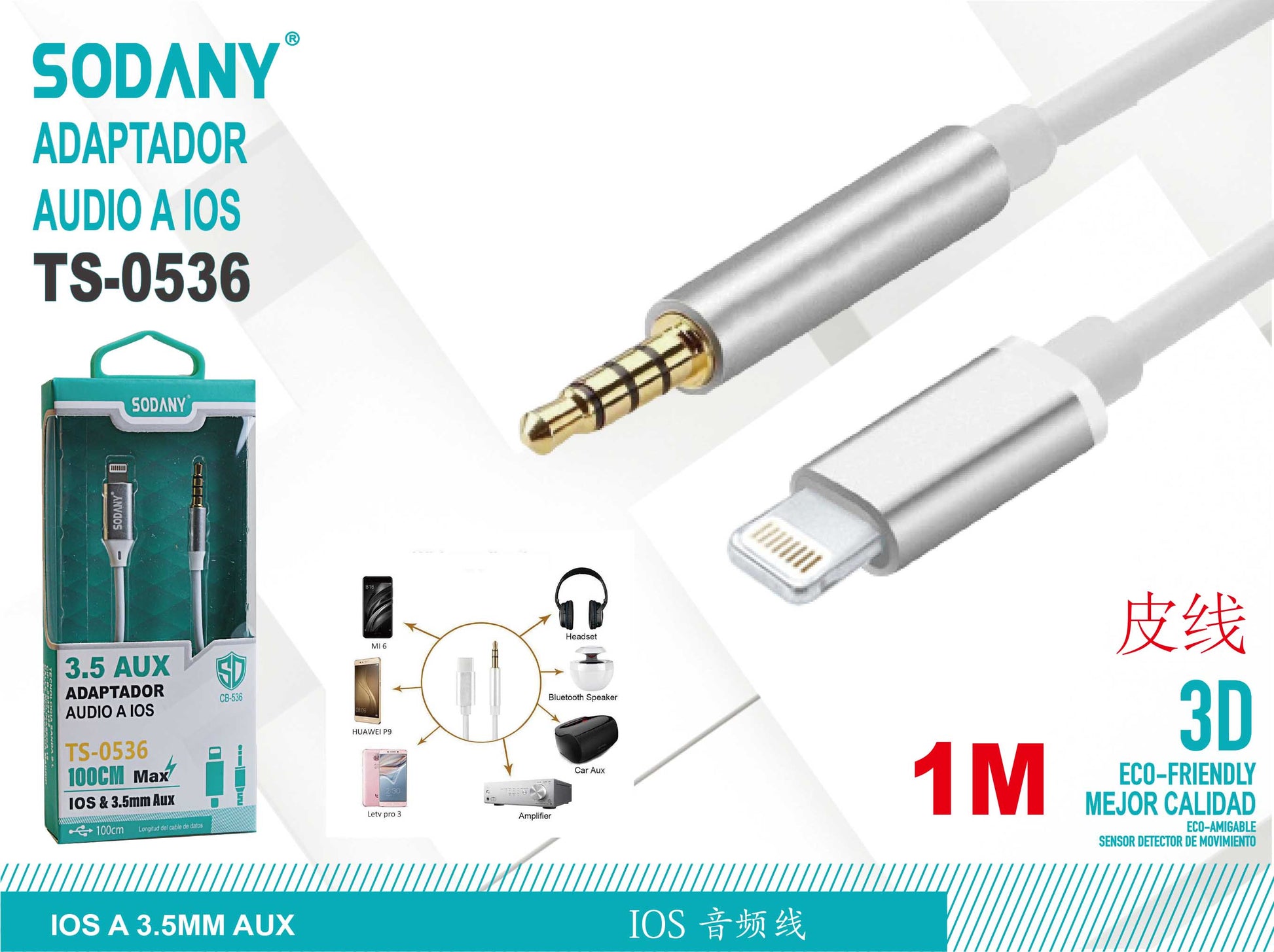 El adaptador de audio Sodany modelo TS-0536 es un cable de 1 metro diseñado para convertir la salida de audio de 3.5mm en un conector compatible con dispositivos iOS, como iPhones y iPads. Este adaptador es ideal para aquellos que desean utilizar sus auriculares o dispositivos de audio con entrada estándar de 3.5mm en dispositivos Apple que solo cuentan con puerto Lightning.