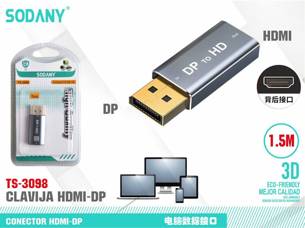Descripción del Producto: El adaptador Sodany TS-3098 es una solución versátil que convierte la señal DisplayPort (DP) a HDMI, permitiendo conectar dispositivos con salida DP a pantallas con entrada HDMI. Su diseño compacto y eficiente lo hace ideal para uso profesional y personal.