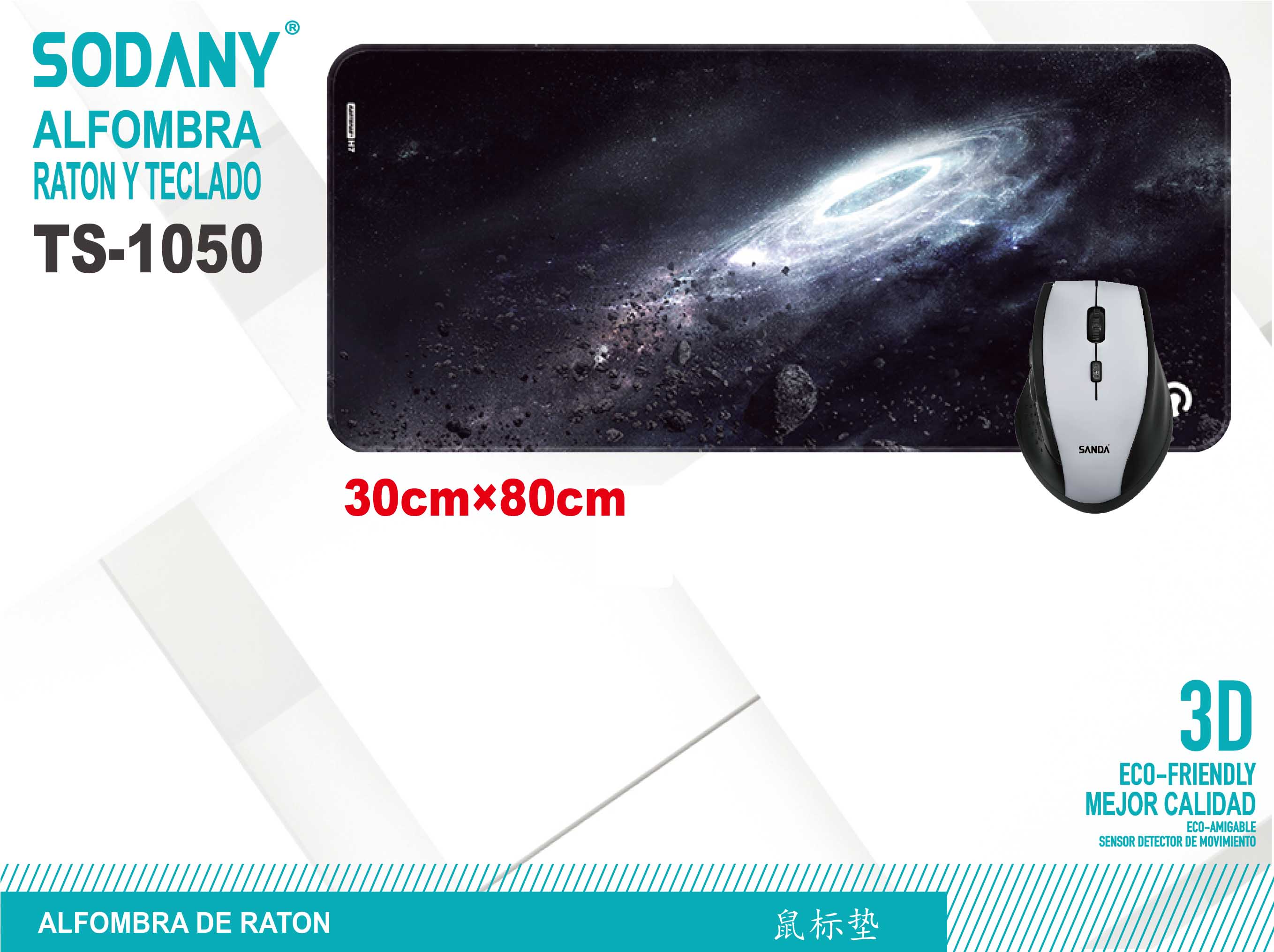 La Alfombra de Ratón Sodany TS-1050 combina funcionalidad y estilo, presentando un diseño gráfico atractivo sobre una amplia superficie de 30 cm x 80 cm. Perfecta para aquellos que desean agregar un toque de personalidad a su espacio de trabajo o gaming.