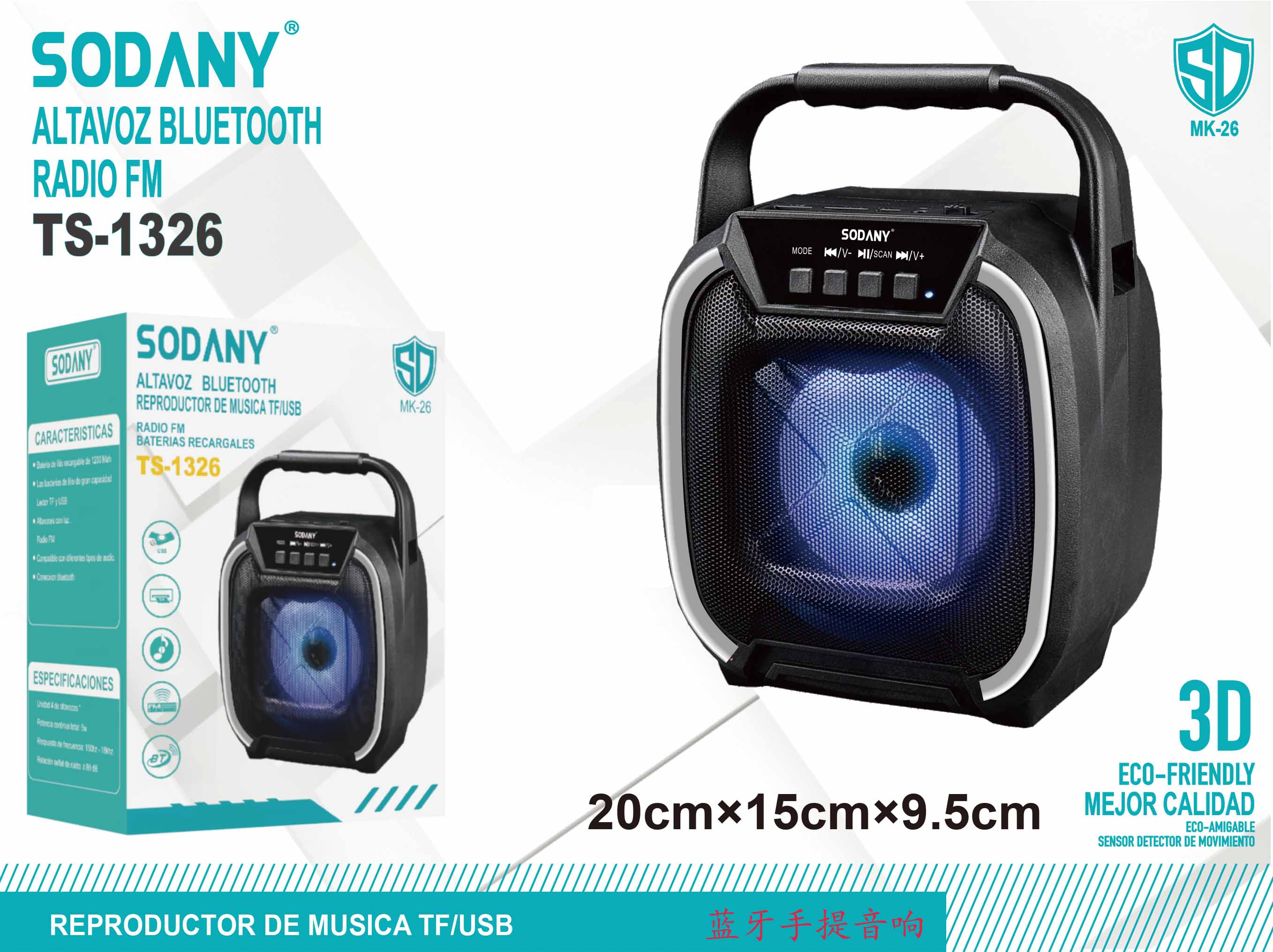El Sodany TS-1326 es un altavoz Bluetooth multifuncional con radio FM, ideal para quienes buscan una experiencia de sonido portátil y de alta calidad. Además de su capacidad para conectarse a dispositivos mediante Bluetooth, este altavoz incluye funciones adicionales como reproducción de música desde tarjetas TF y USB, todo en un diseño compacto y fácil de transportar.