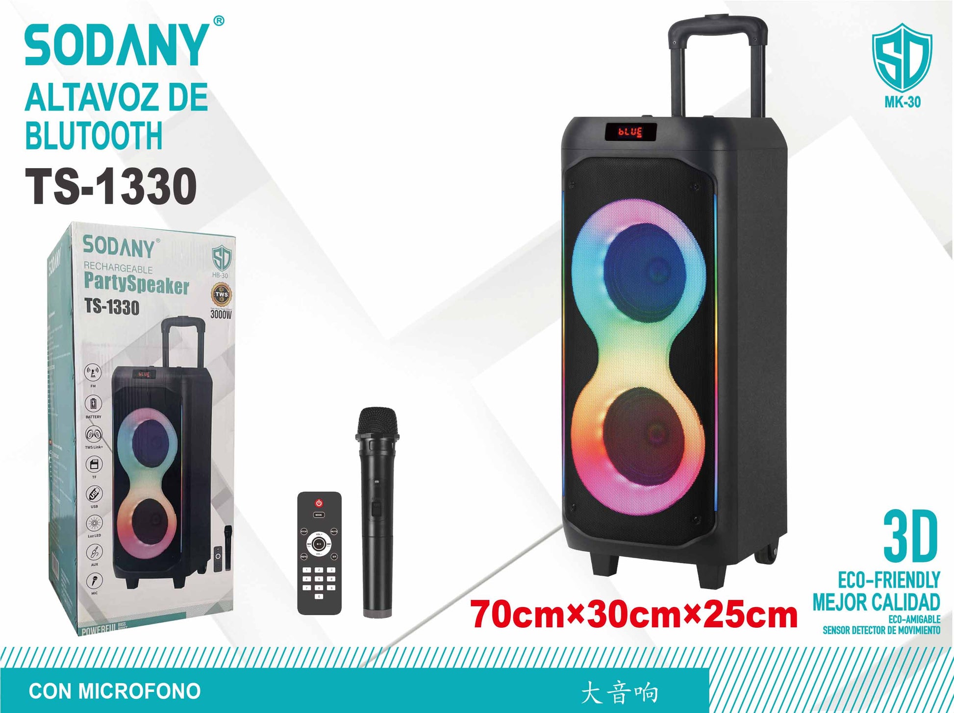 El Sodany TS-1330 es un altavoz Bluetooth de gran tamaño, diseñado para ser el centro de atención en cualquier fiesta o evento. Este altavoz, con su diseño imponente y luces LED multicolores, ofrece un sonido potente y de alta calidad. Incluye un micrófono inalámbrico para karaoke o presentaciones, junto con un control remoto para manejar fácilmente la música y las luces. Su diseño portátil con ruedas y un asa telescópica facilita su transporte.