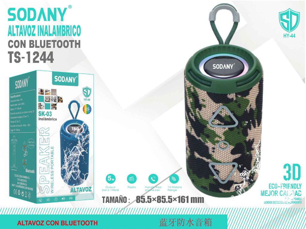 El Sodany TS-1244 es un altavoz Bluetooth portátil y resistente, diseñado para ofrecer un sonido potente y claro en cualquier entorno. Con su diseño de camuflaje y su estructura robusta, este altavoz es ideal para actividades al aire libre y aventuras.