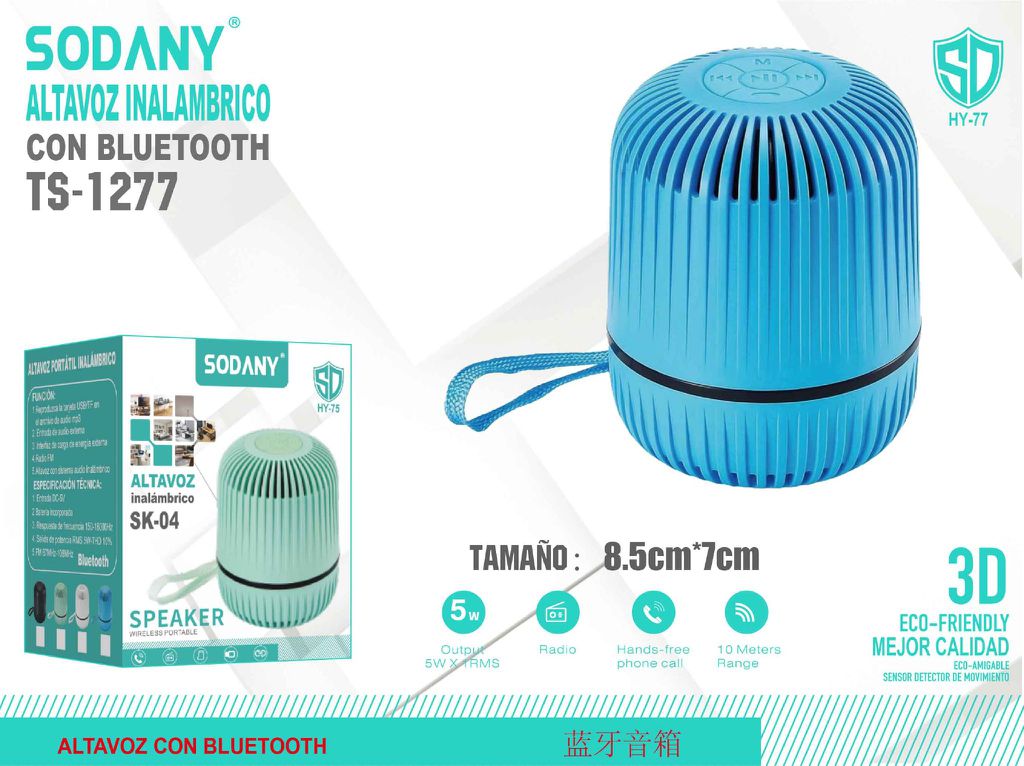 El Sodany TS-1277 es un altavoz inalámbrico Bluetooth portátil, diseñado para ofrecer un sonido de alta calidad en un formato compacto. Su diseño moderno y colorido lo hace ideal para cualquier ambiente, ya sea en casa, en la oficina o en exteriores. Con características adicionales como la radio FM y la función de manos libres, este altavoz es el complemento perfecto para tus dispositivos móviles.