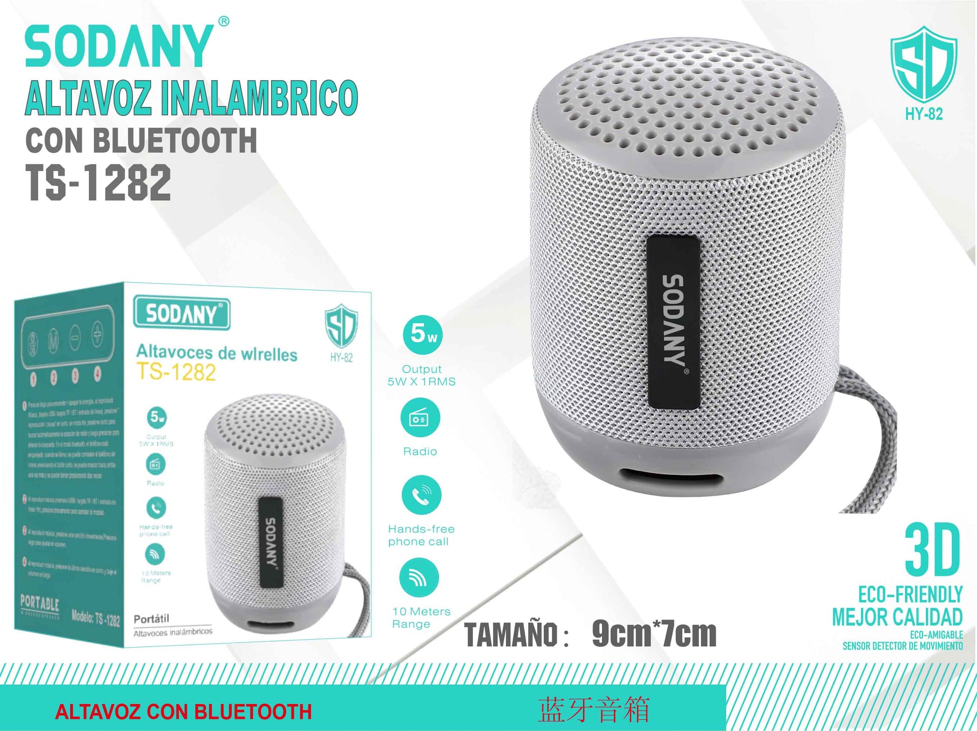 El Sodany TS-1282 es un altavoz inalámbrico Bluetooth diseñado para ofrecer un sonido potente en un diseño moderno y portátil con un elegante acabado en color gris claro. Ideal para quienes buscan un dispositivo compacto pero con gran calidad de sonido, perfecto para cualquier ocasión.