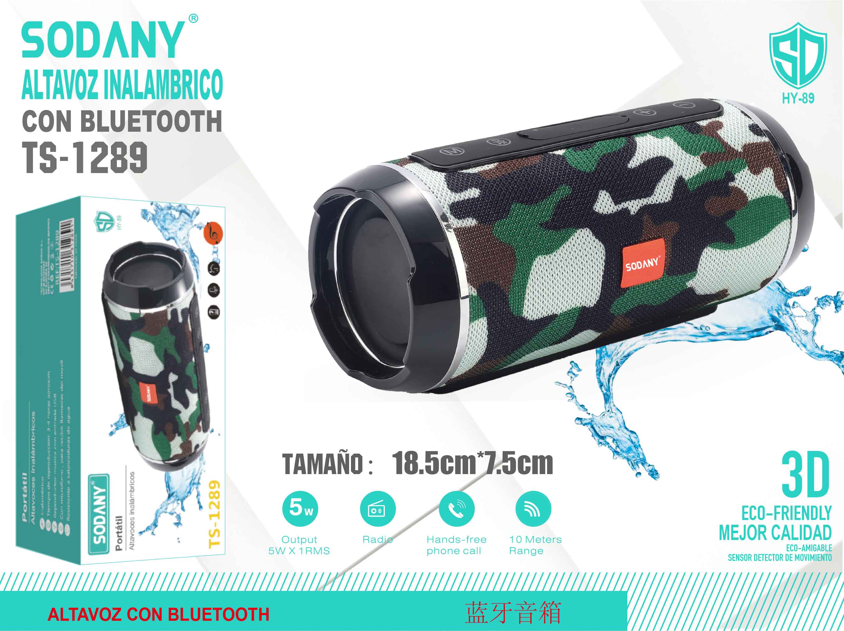 El Sodany TS-1289 es un altavoz inalámbrico Bluetooth diseñado para los amantes de la música que buscan un dispositivo portátil y duradero con un diseño de camuflaje único. Ideal para su uso en exteriores, este altavoz combina estilo, potencia y funcionalidad.
