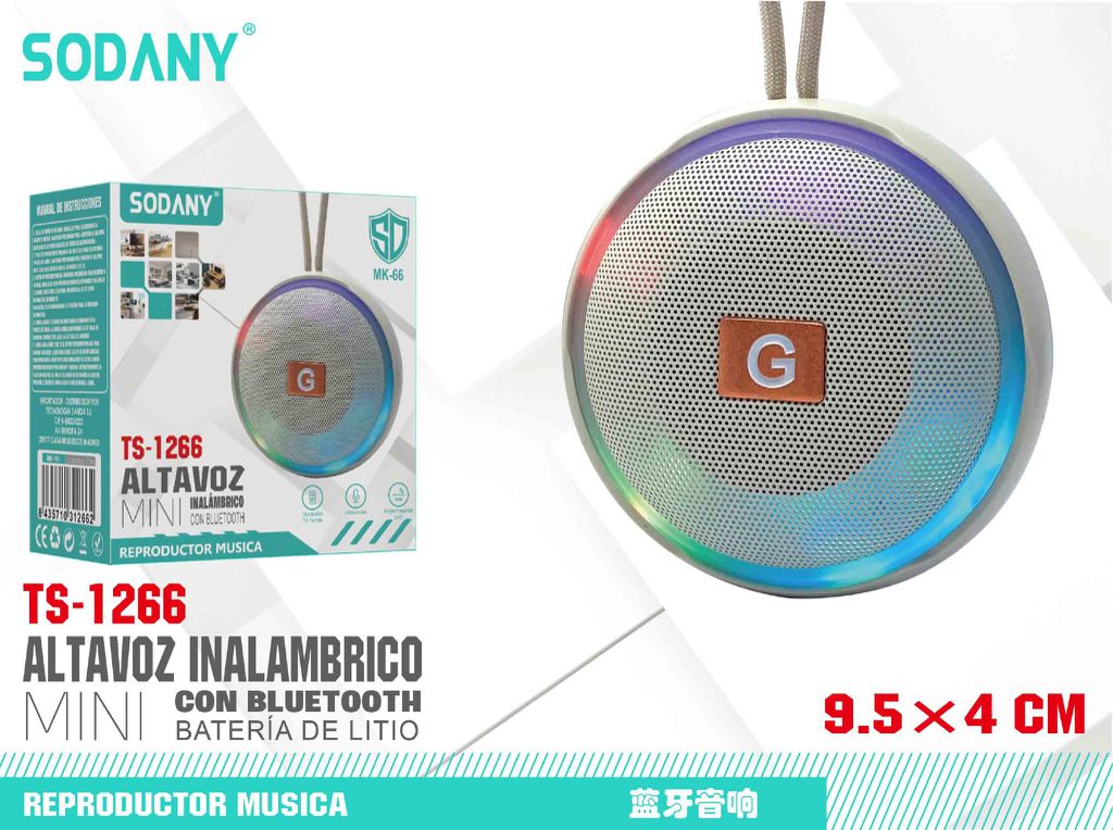 El altavoz inalámbrico Sodany TS-1266 combina un diseño compacto y moderno con luces LED integradas para una experiencia auditiva vibrante. Este dispositivo es perfecto para aquellos que buscan un altavoz portátil y fácil de usar, ideal para cualquier ocasión.