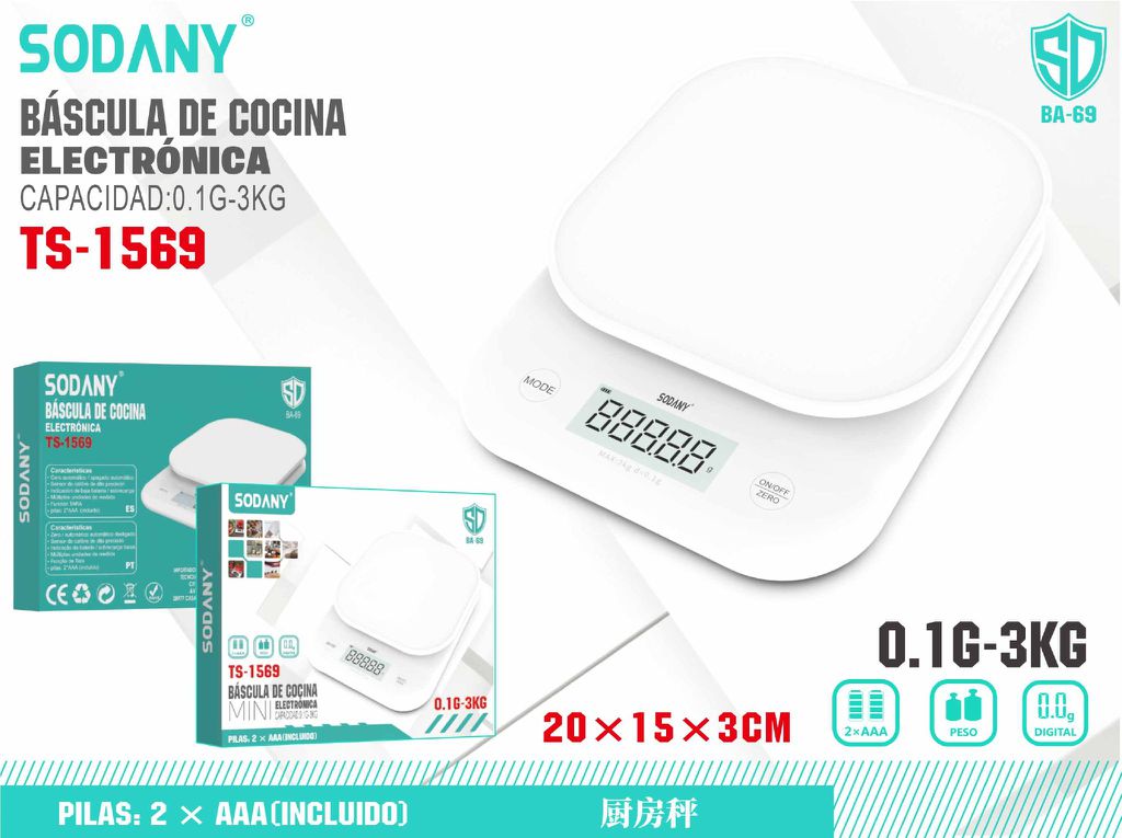 La báscula de cocina electrónica Sodany TS-1569 es una herramienta esencial para cualquier cocina, diseñada para ofrecer precisión en la medición de ingredientes con una capacidad que va desde 0.1g hasta 3kg. Con una plataforma amplia y una pantalla digital clara, esta báscula facilita la preparación de recetas, asegurando mediciones exactas. Su diseño compacto y elegante se adapta perfectamente a cualquier estilo de cocina.