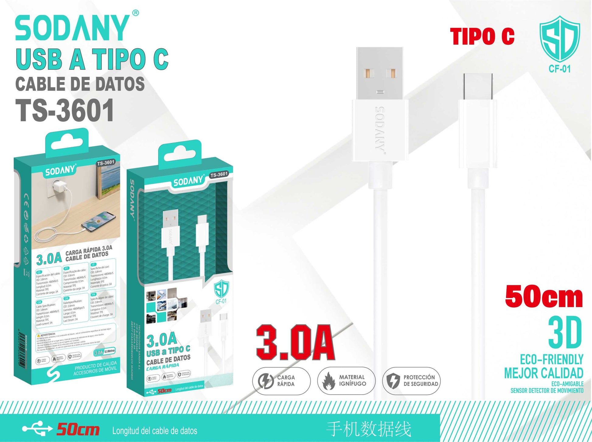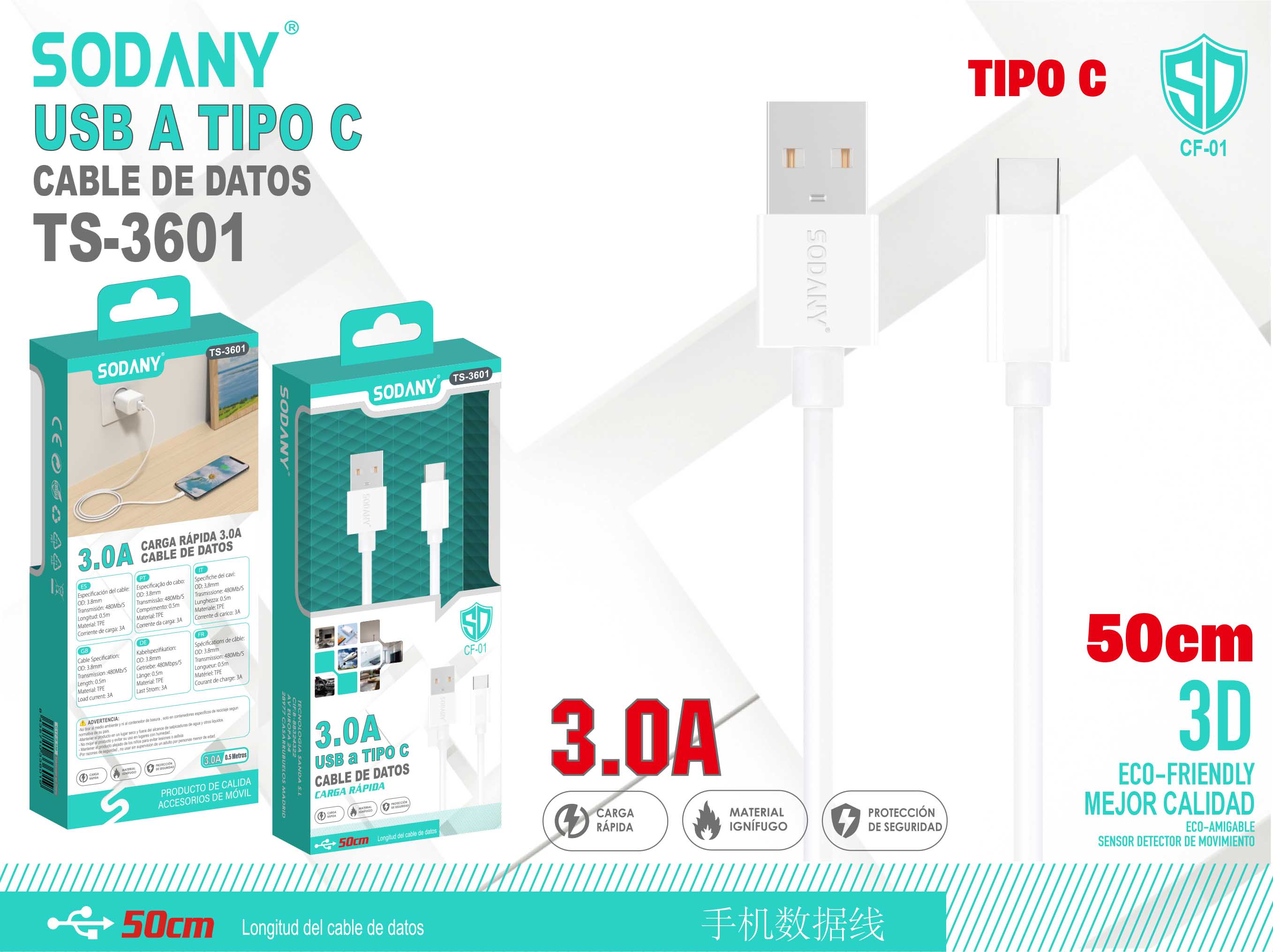 Cable USB a Tipo C 50cm 3.0A
