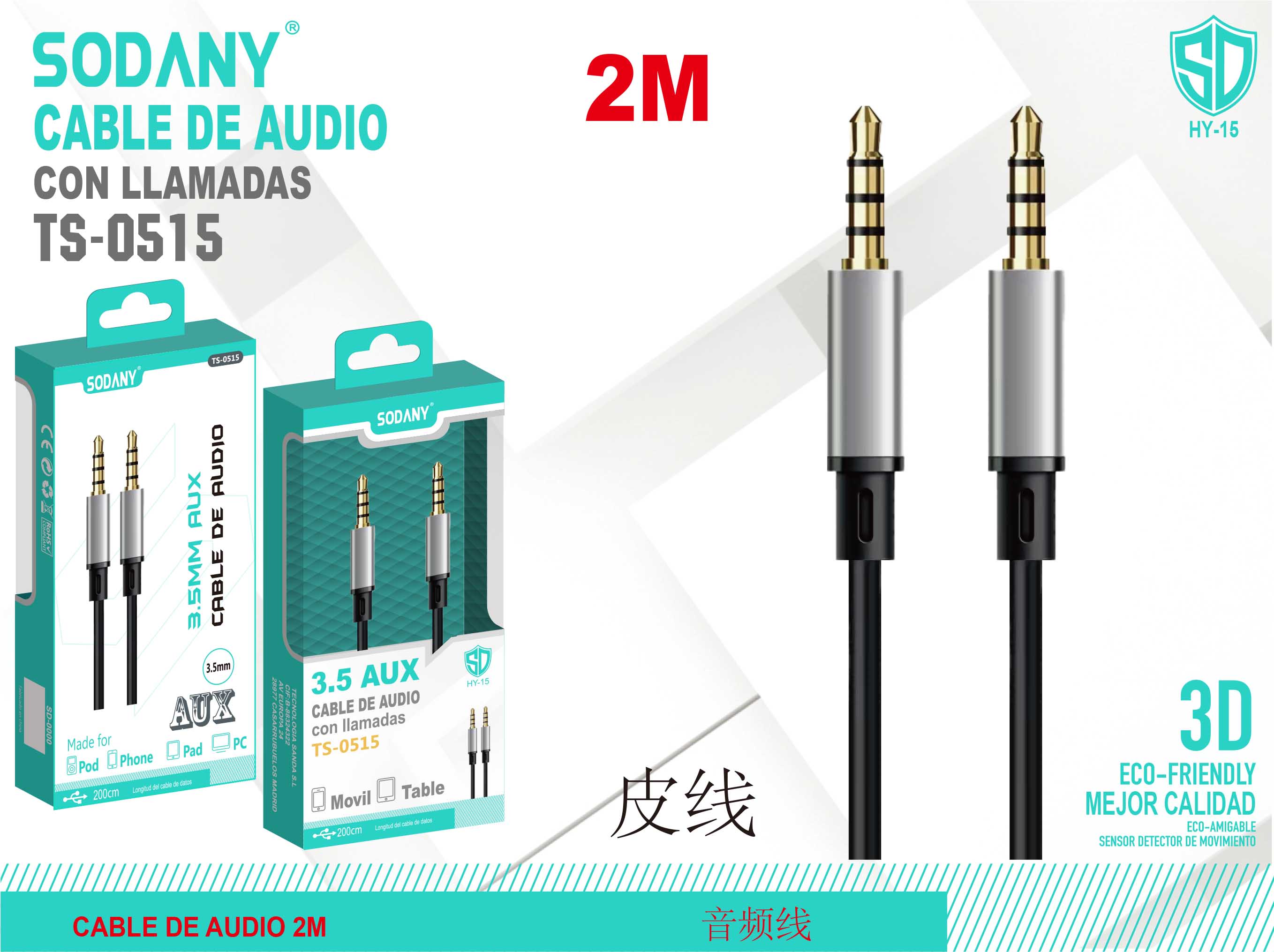 El cable de audio Sodany modelo TS-0515 es un cable auxiliar de alta calidad de 2 metros de longitud, diseñado para conectar dispositivos de audio mediante un conector de 3.5mm. Además, cuenta con soporte para llamadas, lo que permite utilizarlo tanto para reproducción de música como para contestar llamadas cuando está conectado a un dispositivo móvil.