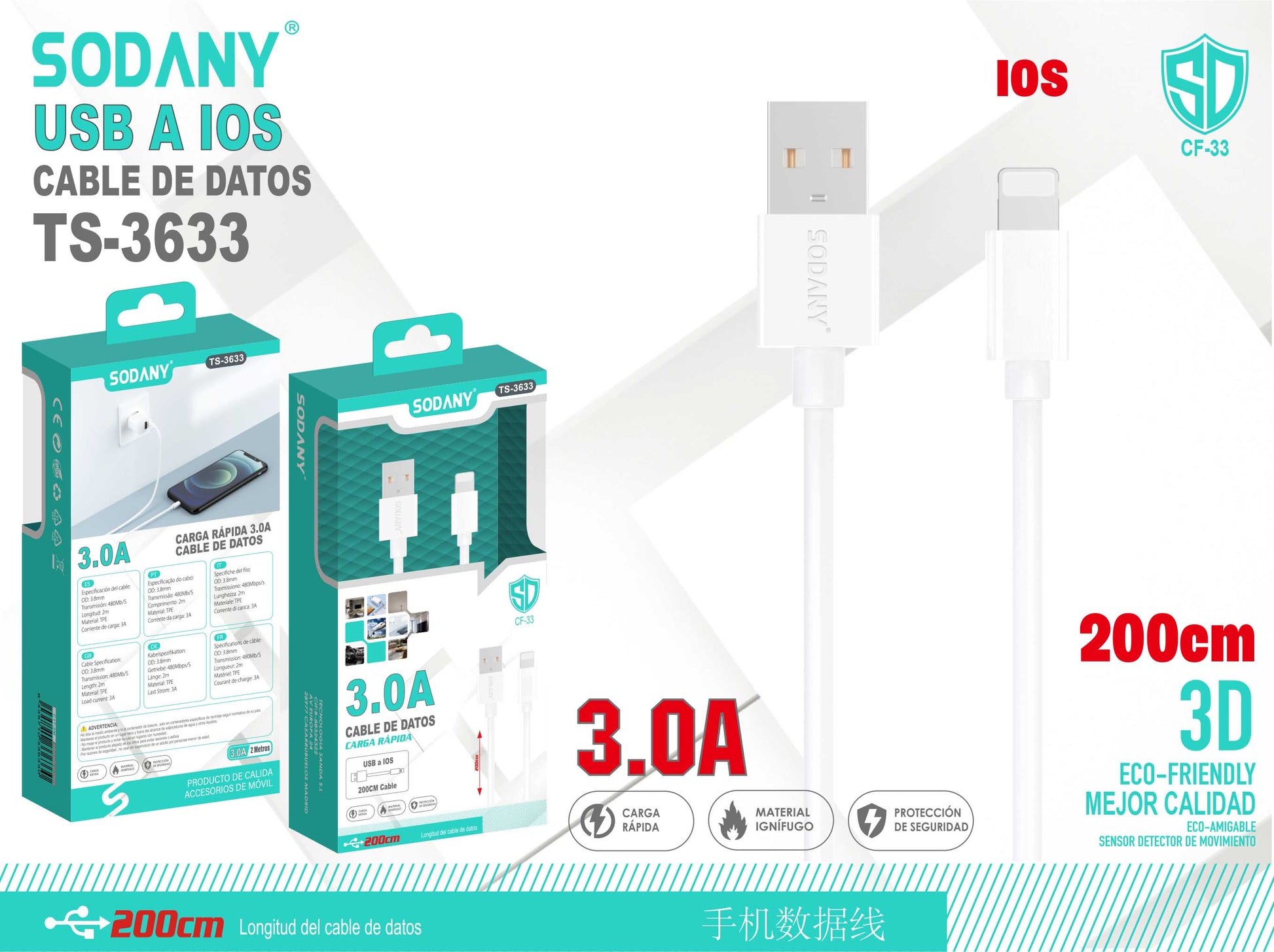 Cable USB a iOS de 200 cm de longitud, diseñado para proporcionar una carga rápida y eficiente. Este cable de carga soporta una corriente de hasta 3.0A, asegurando una carga rápida y segura para tus dispositivos compatibles. Ideal para iPhones, iPads y otros dispositivos con puerto iOS.