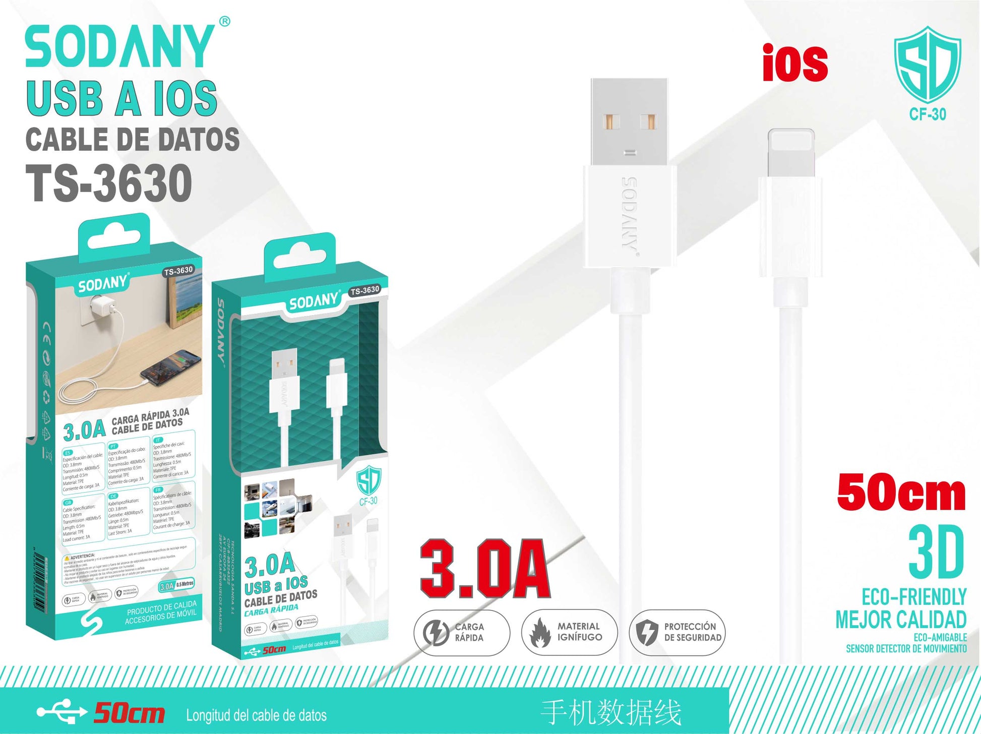 Cable USB a iOS de 50 cm de longitud, diseñado para proporcionar una carga rápida y eficiente. Este cable de carga soporta una corriente de hasta 3.0A, asegurando una carga rápida y segura para tus dispositivos compatibles. Ideal para iPhones, iPads y otros dispositivos con puerto iOS.