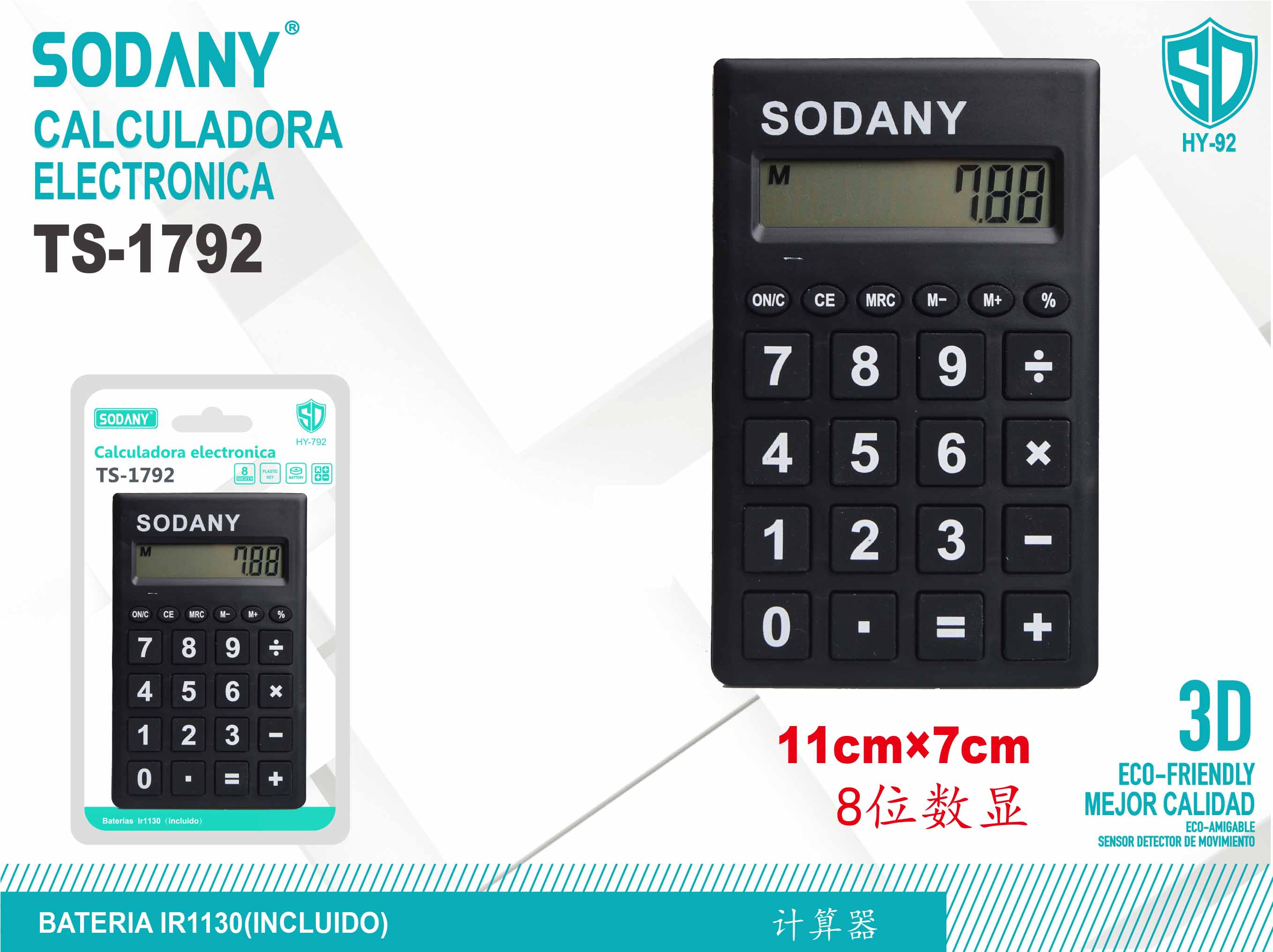 La calculadora electrónica Sodany TS-1792 es un dispositivo básico y funcional, ideal para tareas cotidianas de cálculo. Su diseño compacto y la facilidad de uso la hacen perfecta para estudiantes y profesionales que necesitan realizar operaciones simples de manera rápida y eficiente.