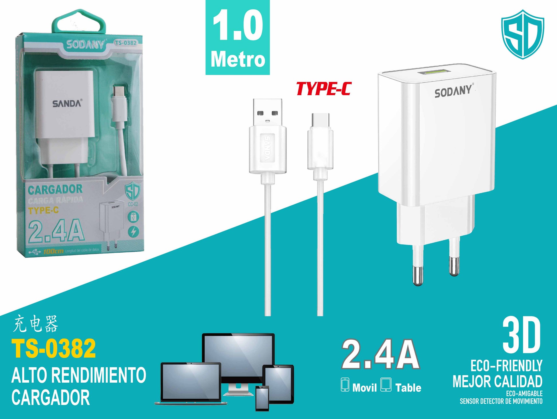Cargador con cable Tipo C, diseñado para proporcionar una carga rápida y eficiente. Este cargador soporta una corriente de hasta 2.4A, asegurando una carga rápida y segura para tus dispositivos compatibles. Ideal para smartphones, tablets y otros dispositivos con puerto Tipo C. El paquete incluye un cable Tipo C de 1 metro.