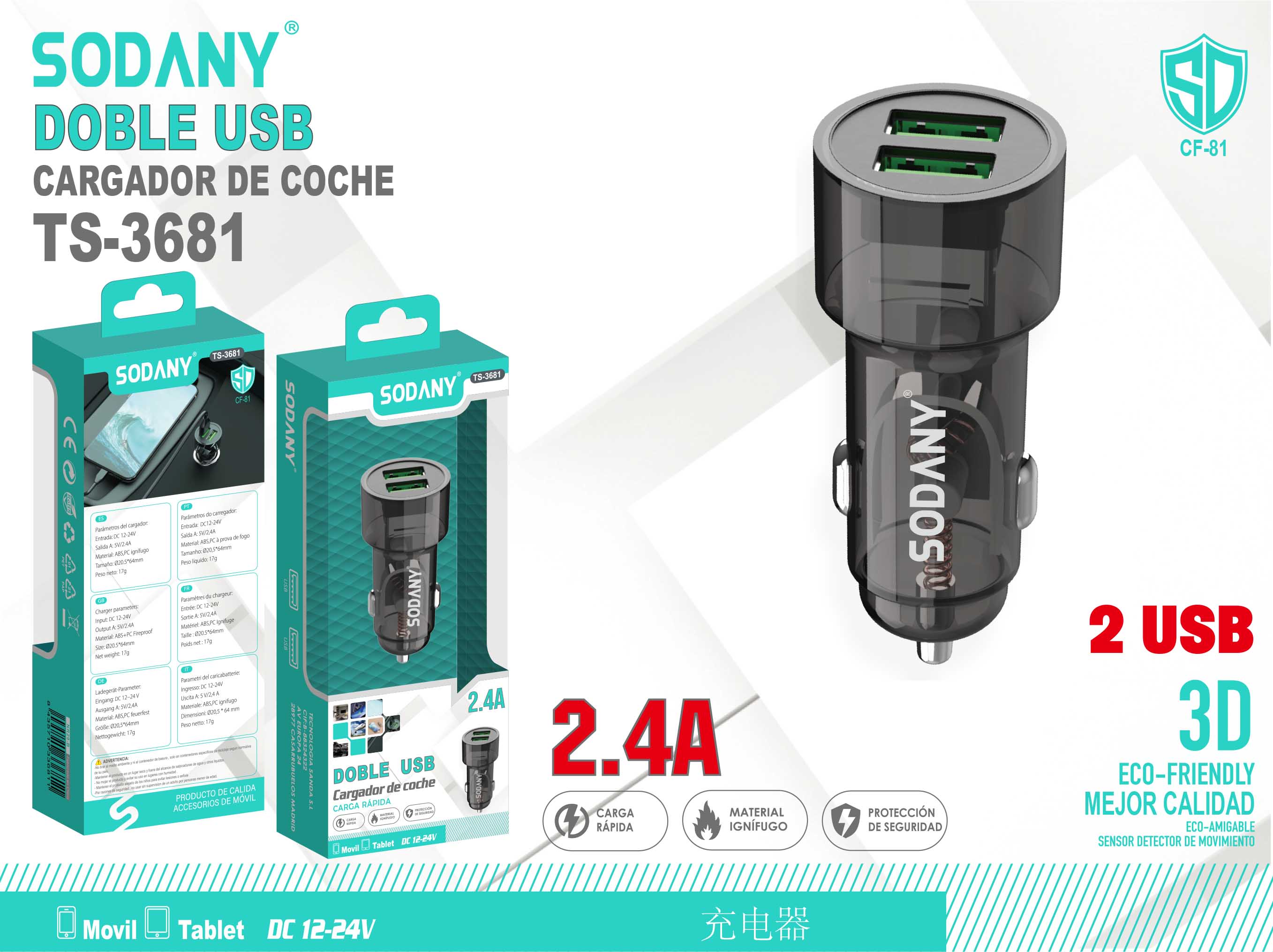Cargador de coche doble USB con una salida total de 2.4A, diseñado para cargar múltiples dispositivos simultáneamente mientras estás en movimiento. Este cargador de coche compacto y eficiente es ideal para mantener tus dispositivos móviles y tablets cargados durante tus viajes.