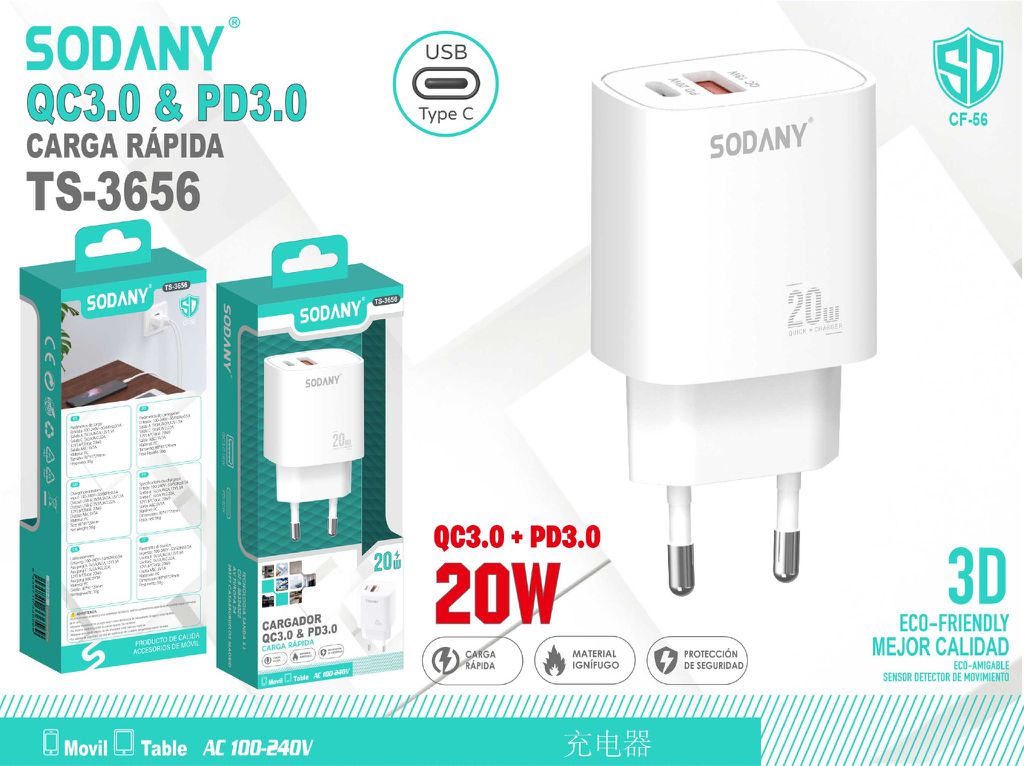 El cargador de pared Sodany QC3.0 + PD3.0 de 20W, modelo TS-3656, es un dispositivo avanzado que combina la tecnología Quick Charge 3.0 y Power Delivery 3.0 para ofrecer una carga rápida y eficiente. Este cargador es ideal para aquellos que buscan cargar sus dispositivos electrónicos en el menor tiempo posible, con la máxima seguridad y eficiencia energética.