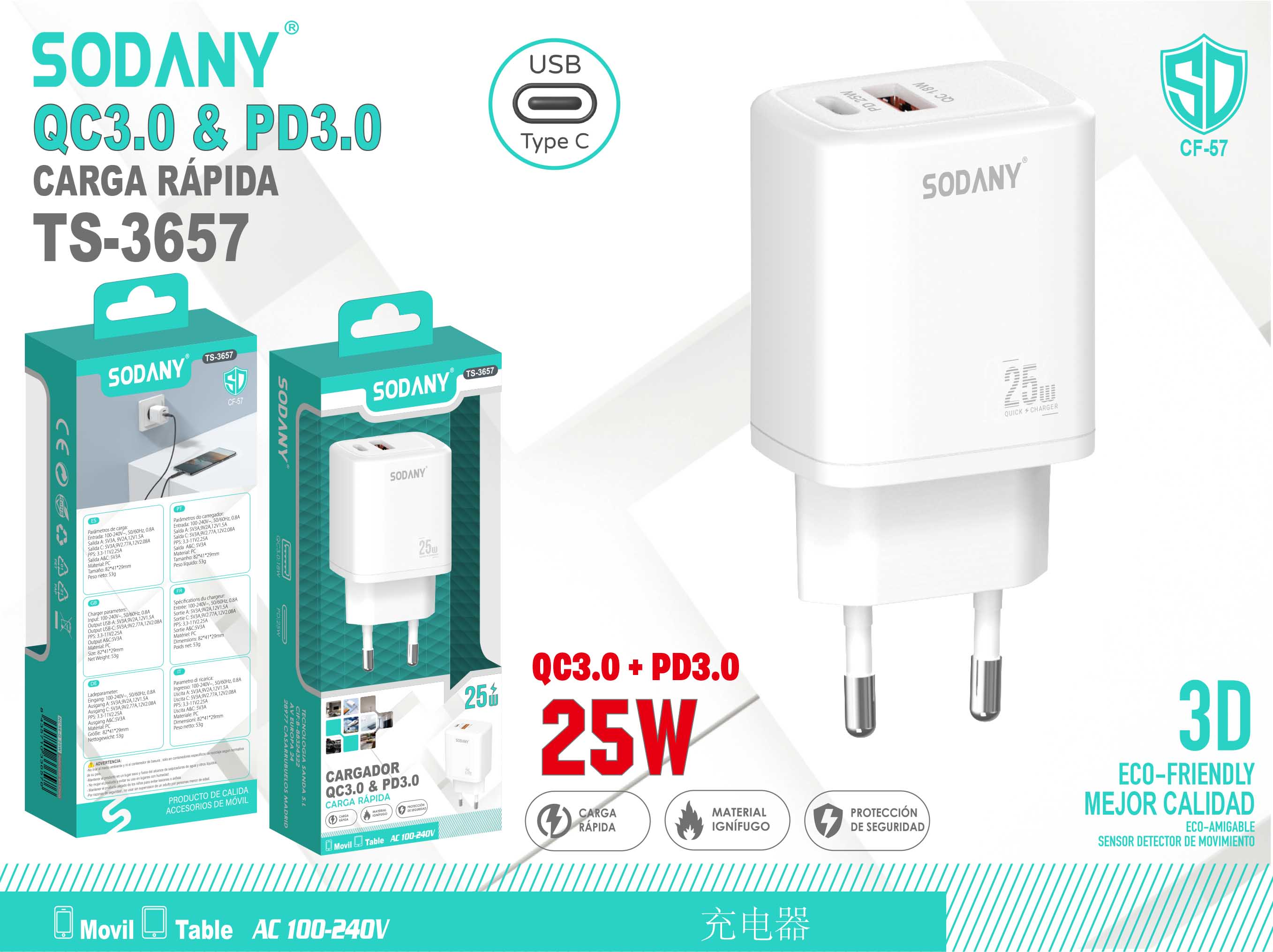 El cargador de pared Sodany QC3.0 + PD3.0 de 25W, modelo TS-3657, ofrece una capacidad de carga rápida de alta potencia, compatible con dispositivos que soportan Quick Charge 3.0 y Power Delivery 3.0. Es ideal para usuarios que requieren un cargador versátil, eficiente y rápido para sus dispositivos electrónicos.