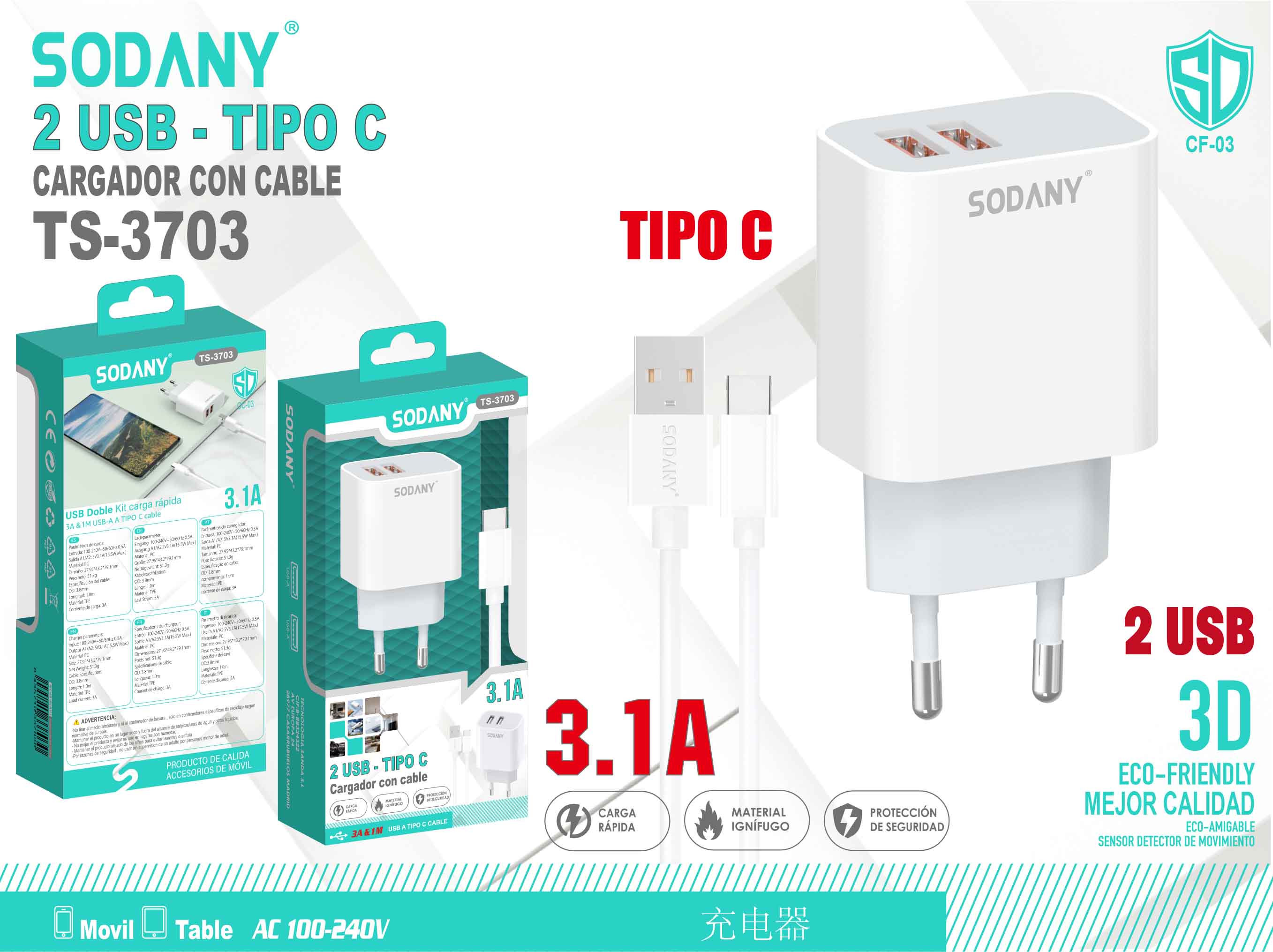 Cargador Dual USB a Tipo C con Cable de 3.1A