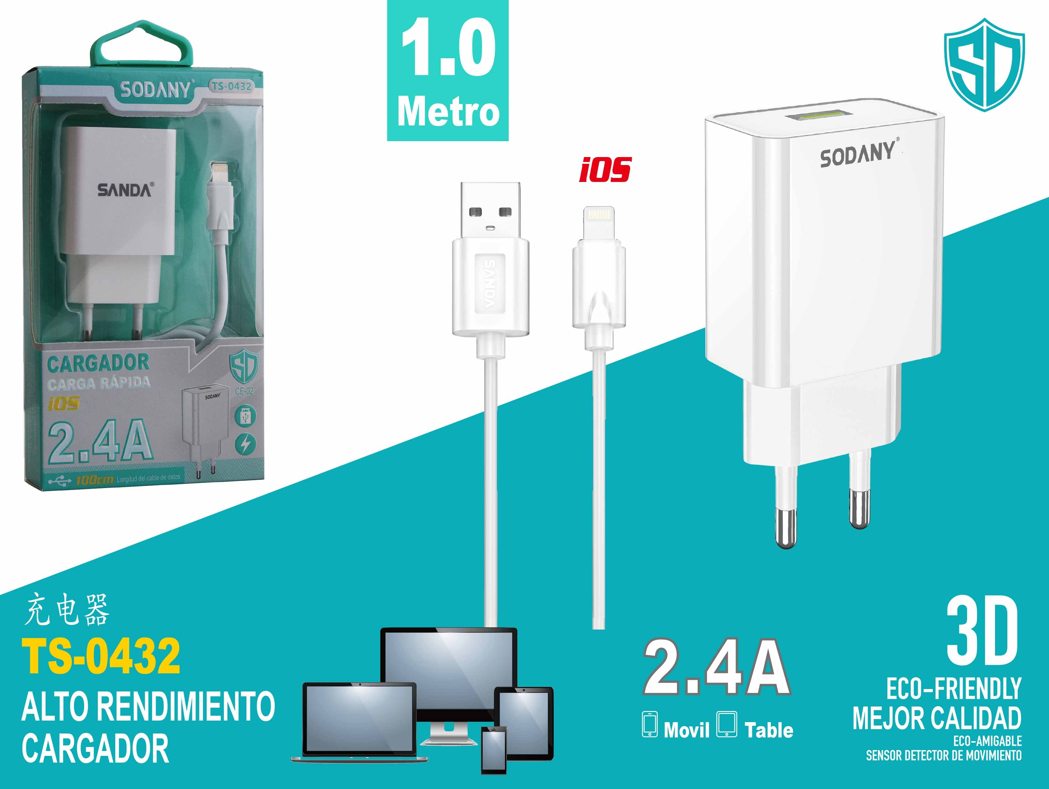 Cargador para dispositivos iOS con cable integrado, diseñado para proporcionar una carga rápida y eficiente. Este cargador soporta una corriente de hasta 2.4A, asegurando una carga rápida y segura para tus dispositivos compatibles. Ideal para smartphones y tablets de Apple. El paquete incluye un cable compatible con iOS de 1 metro.