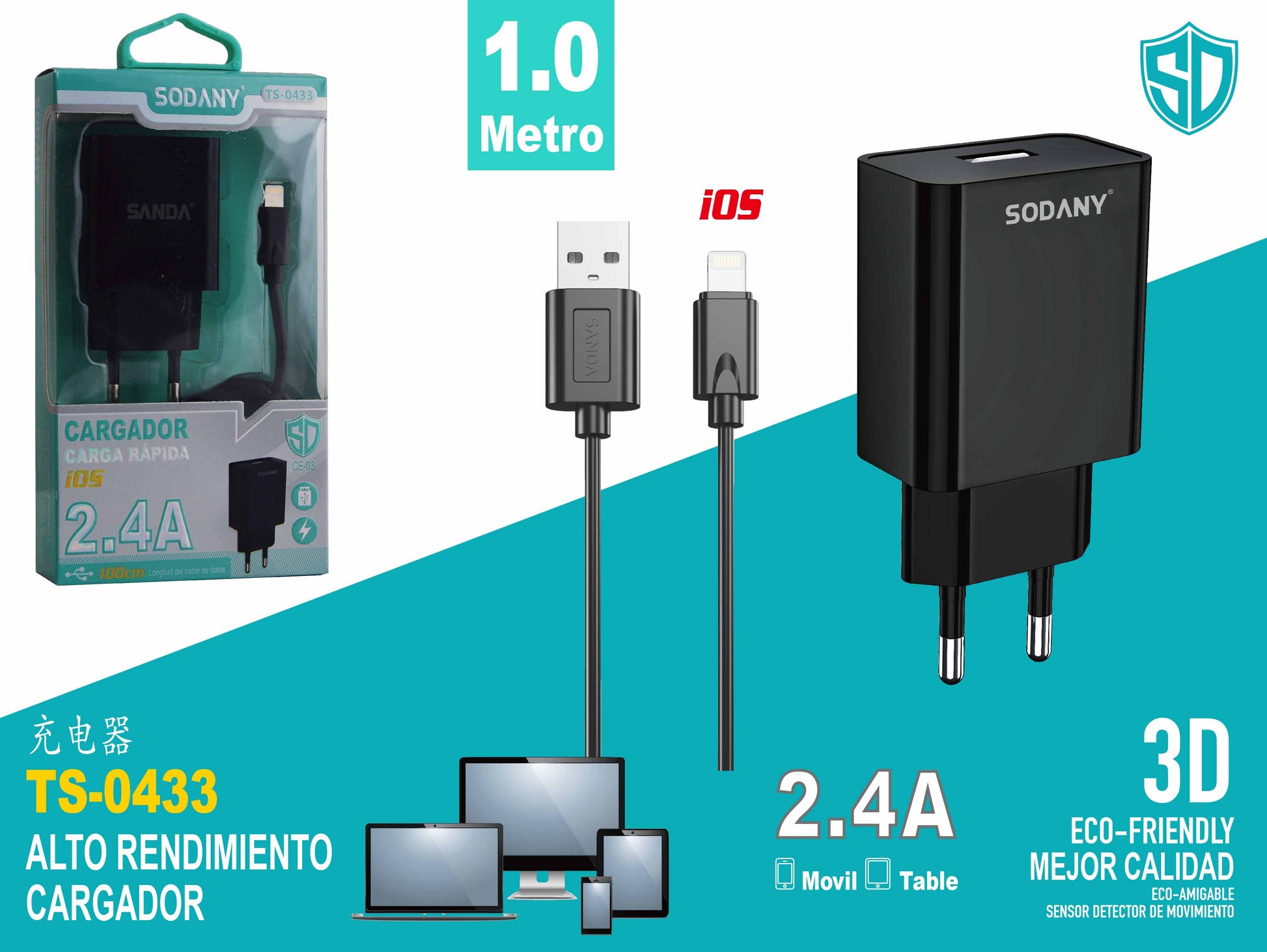 Cargador para dispositivos iOS con cable integrado, diseñado para proporcionar una carga rápida y eficiente. Este cargador soporta una corriente de hasta 2.4A, asegurando una carga rápida y segura para tus dispositivos compatibles. Ideal para smartphones y tablets de Apple. El paquete incluye un cable compatible con iOS de 1 metro. Presentado en color negro para un estilo elegante y moderno.