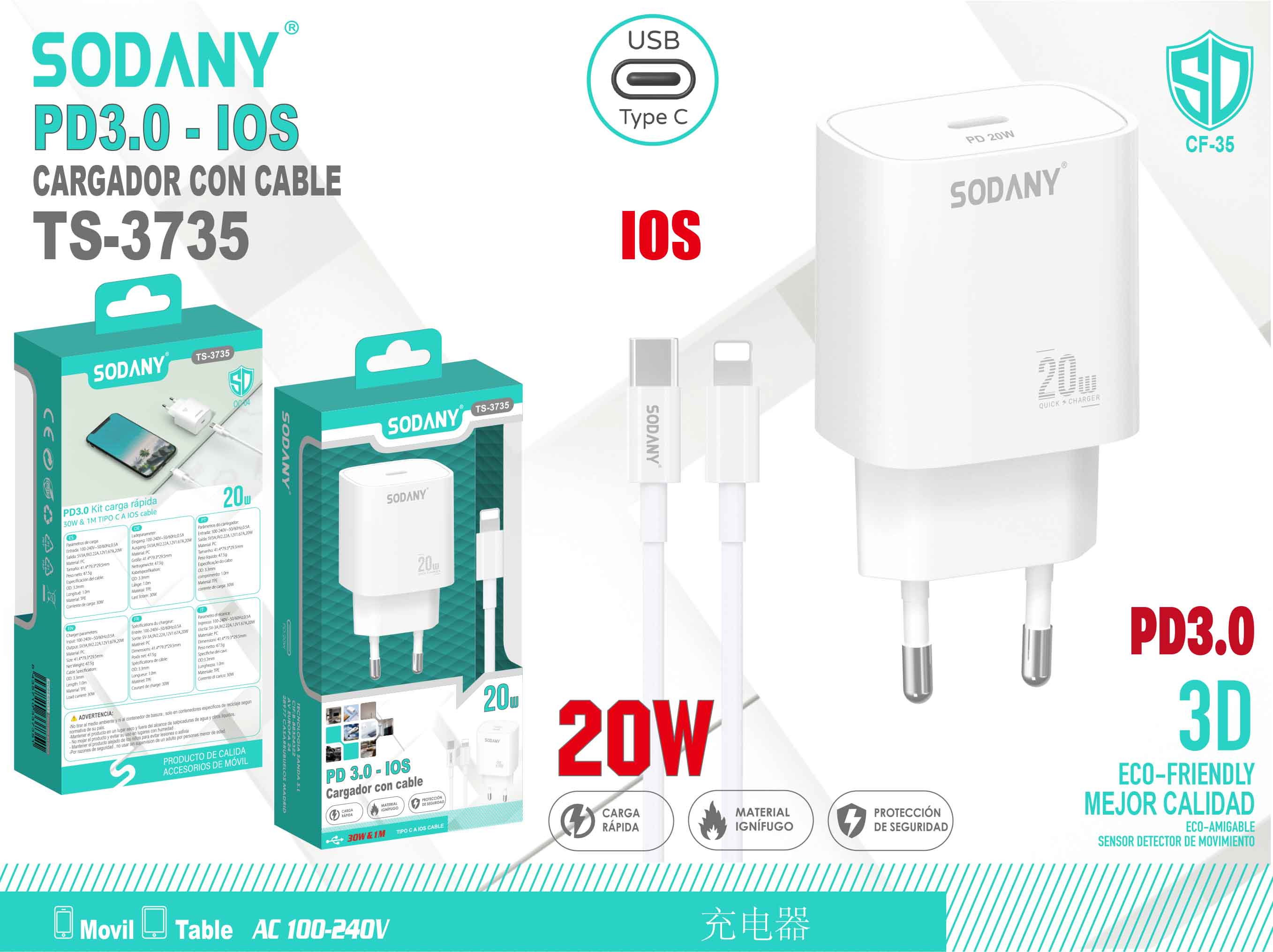 Cargador PD3.0 para dispositivos iOS con cable integrado, diseñado para proporcionar una carga rápida y eficiente. Este cargador soporta una potencia de hasta 20W con tecnología PD3.0, asegurando una carga rápida y segura para tus dispositivos compatibles. Ideal para smartphones y tablets de Apple. El paquete incluye un cable compatible con iOS de 1 metro.