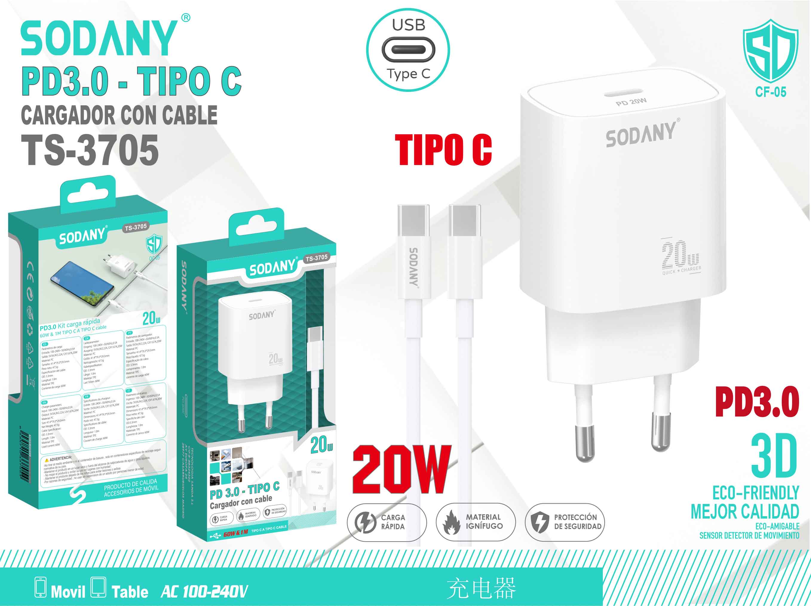Cargador PD3.0 Tipo C con Cable de 20W