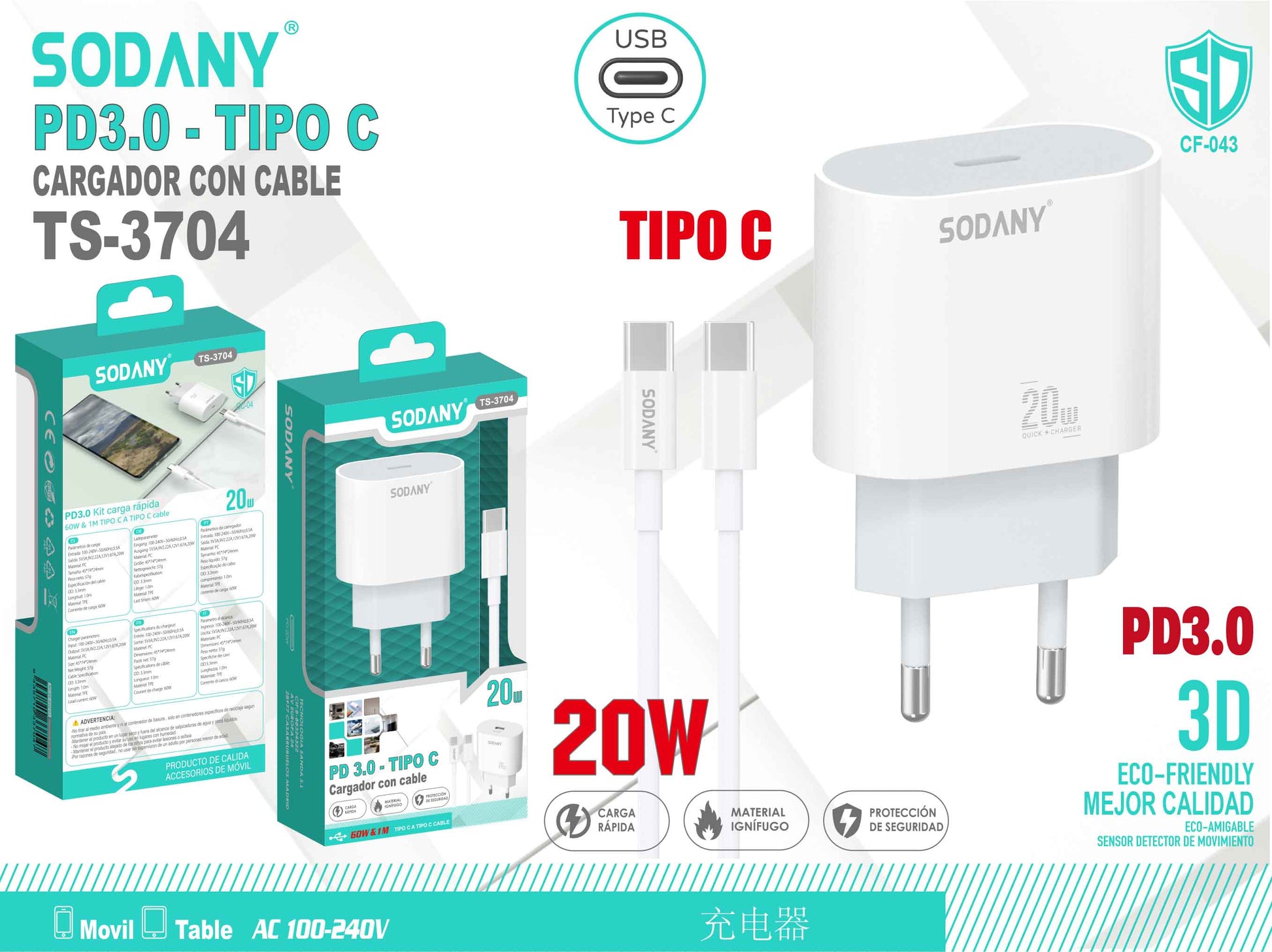 Cargador PD3.0 Tipo C con cable integrado, diseñado para proporcionar una carga rápida y eficiente. Este cargador soporta una potencia de hasta 20W, asegurando una carga rápida y segura para tus dispositivos compatibles. Ideal para smartphones, tablets y otros dispositivos con puerto Tipo C.