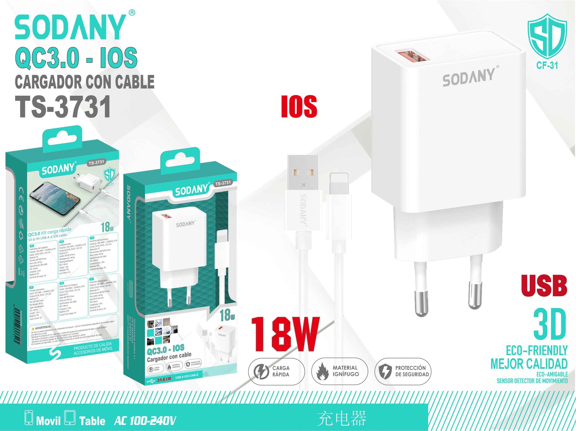 Cargador QC3.0 para dispositivos iOS con cable integrado, diseñado para proporcionar una carga rápida y eficiente. Este cargador soporta una potencia de hasta 18W con tecnología QC3.0, asegurando una carga rápida y segura para tus dispositivos compatibles. Ideal para smartphones y tablets de Apple. El paquete incluye un cable compatible con iOS de 1 metro.