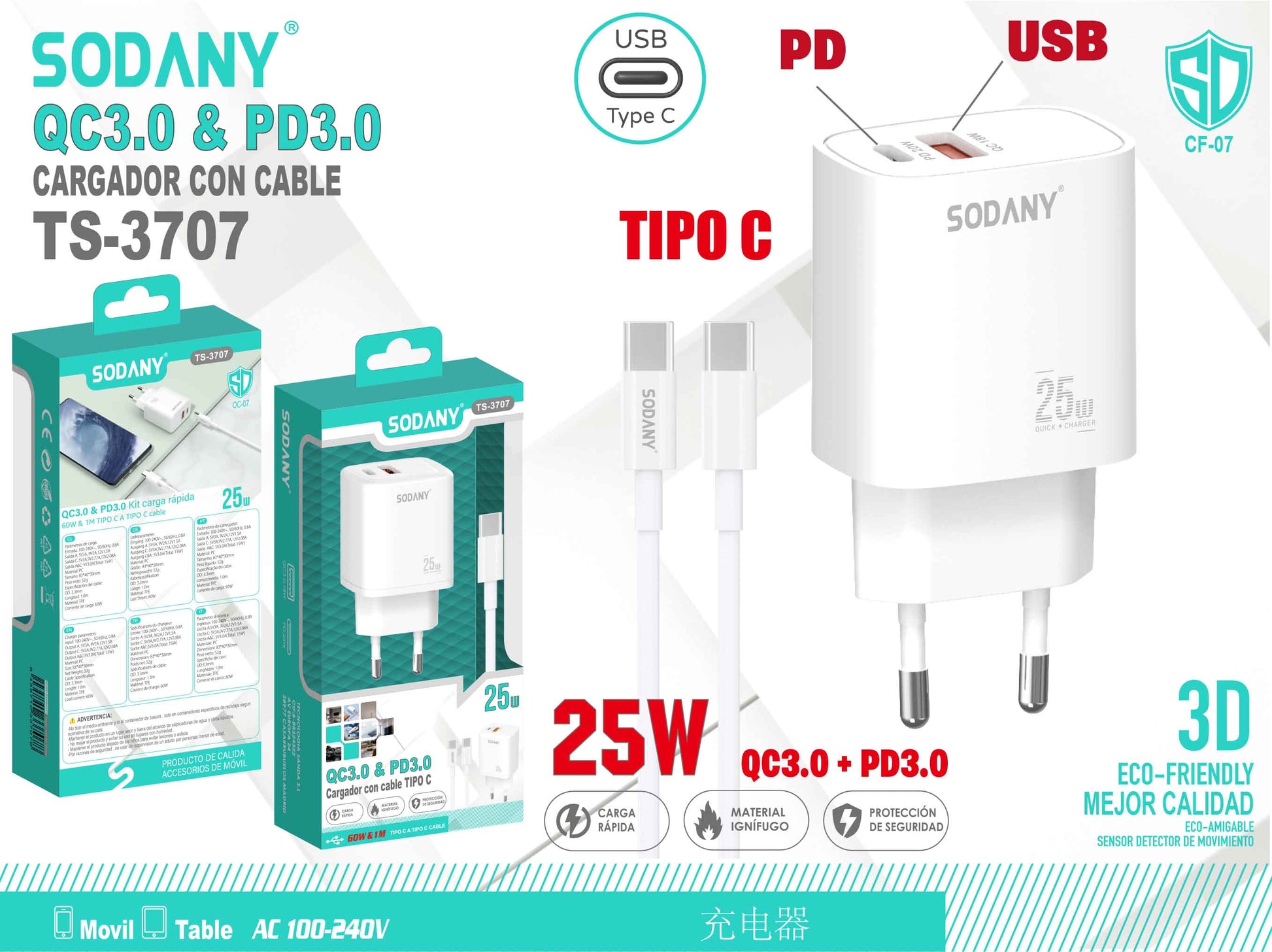 Cargador QC3.0 y PD3.0 con Puertos USB y Tipo C, Cable Tipo C de 25W