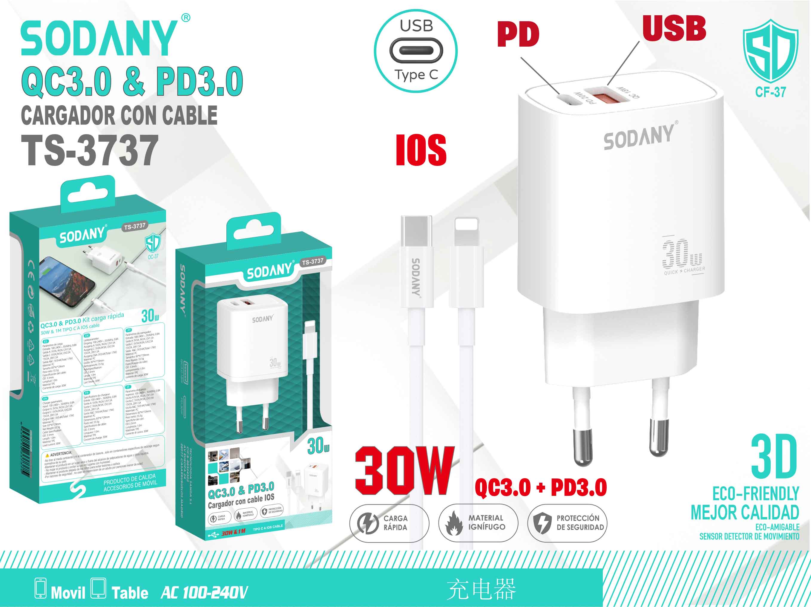Cargador QC3.0 y PD3.0 para iOS con Cable de 30W