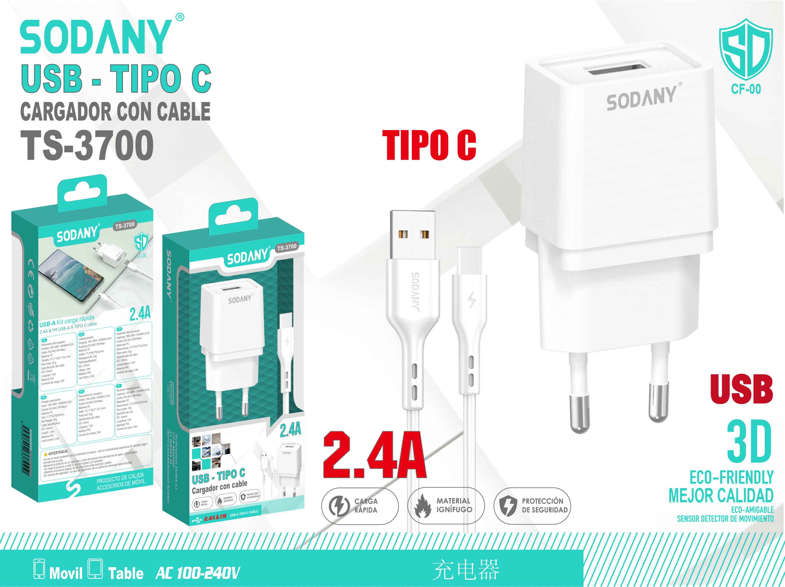 Cargador USB a Tipo C con cable integrado, diseñado para proporcionar una carga rápida y eficiente. Este cargador soporta una corriente de hasta 2.4A, asegurando una carga rápida y segura para tus dispositivos compatibles. Ideal para smartphones, tablets y otros dispositivos con puerto Tipo C.