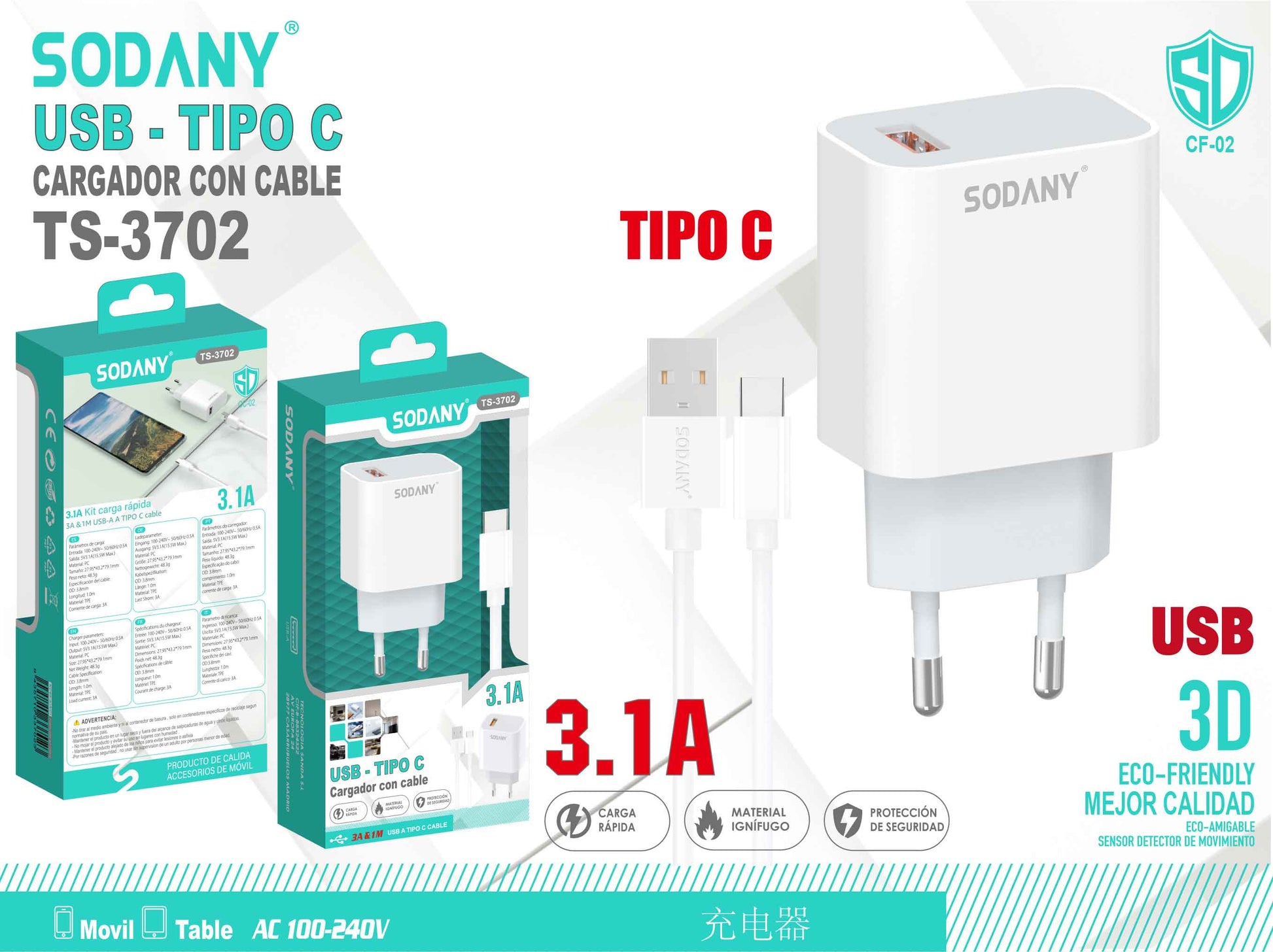 Cargador USB a Tipo C con cable integrado, diseñado para proporcionar una carga rápida y eficiente. Este cargador soporta una corriente de hasta 3.1A, asegurando una carga rápida y segura para tus dispositivos compatibles. Ideal para smartphones, tablets y otros dispositivos con puerto Tipo C.