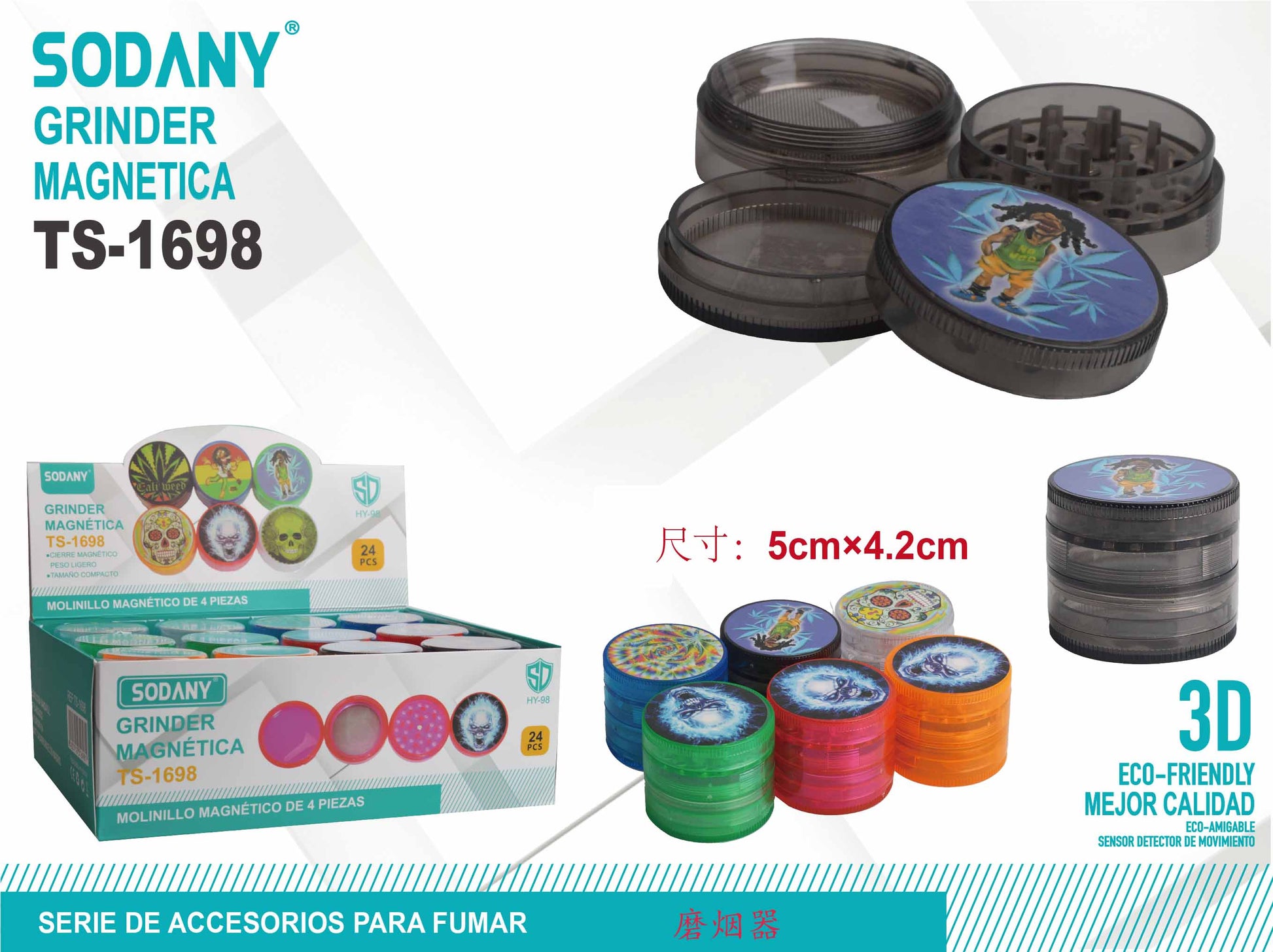El Grinder Magnética Sodany TS-1698 es una herramienta de alta eficiencia diseñada para triturar hierbas y especias. Este modelo cuenta con un sistema magnético que facilita su uso y asegura que el contenido se mantenga seguro durante su manipulación. El grinder tiene un diseño compacto y está disponible en varios colores y diseños impresos atractivos.
