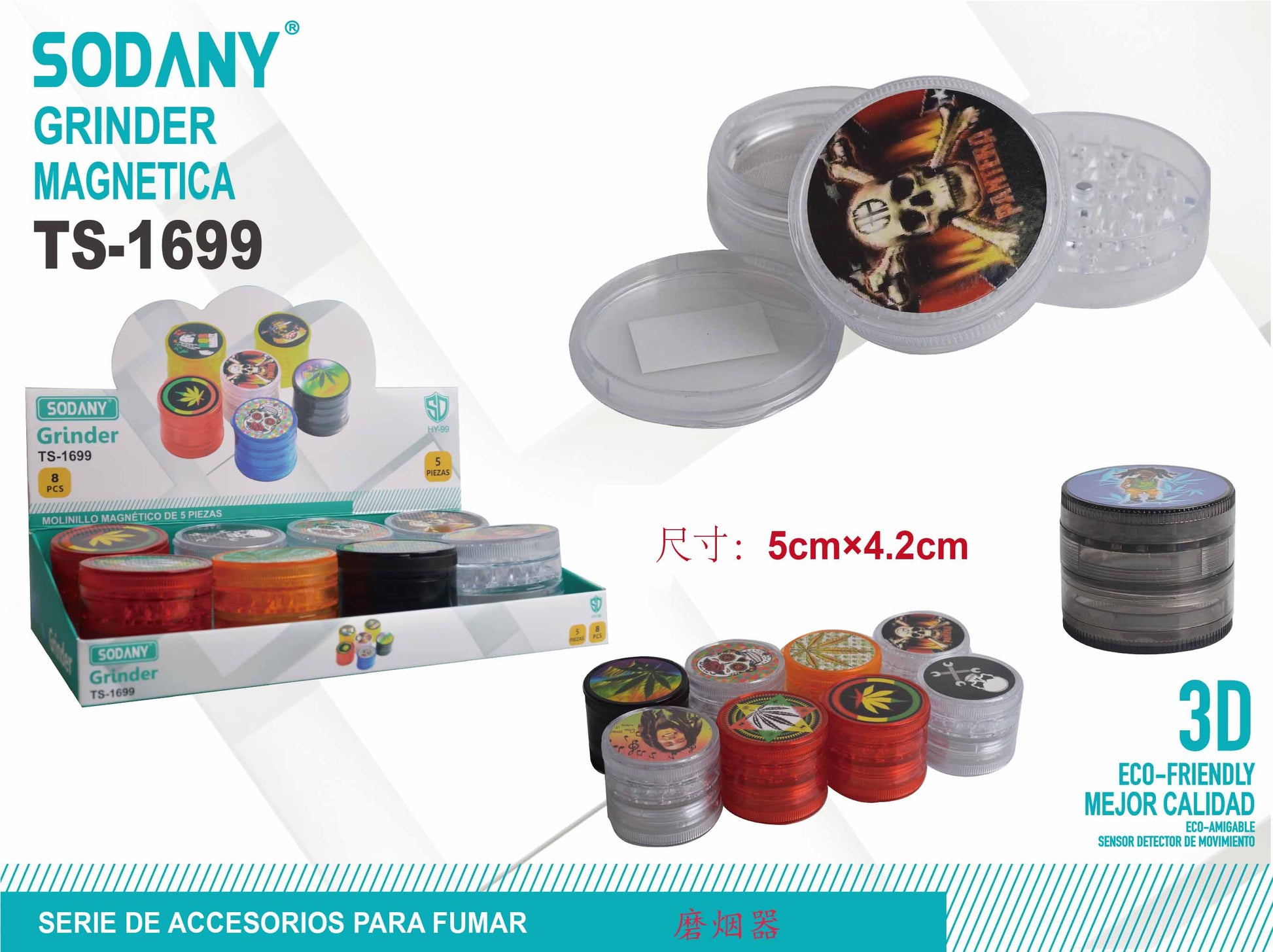 El Grinder Magnética Sodany TS-1699 es una herramienta de alta calidad diseñada para triturar hierbas y especias con eficacia. Este modelo de 5 piezas cuenta con un sistema magnético que facilita su uso y garantiza que el contenido se mantenga seguro durante su manipulación. Está disponible en una variedad de diseños y colores, lo que lo convierte en una opción atractiva y funcional para los usuarios.