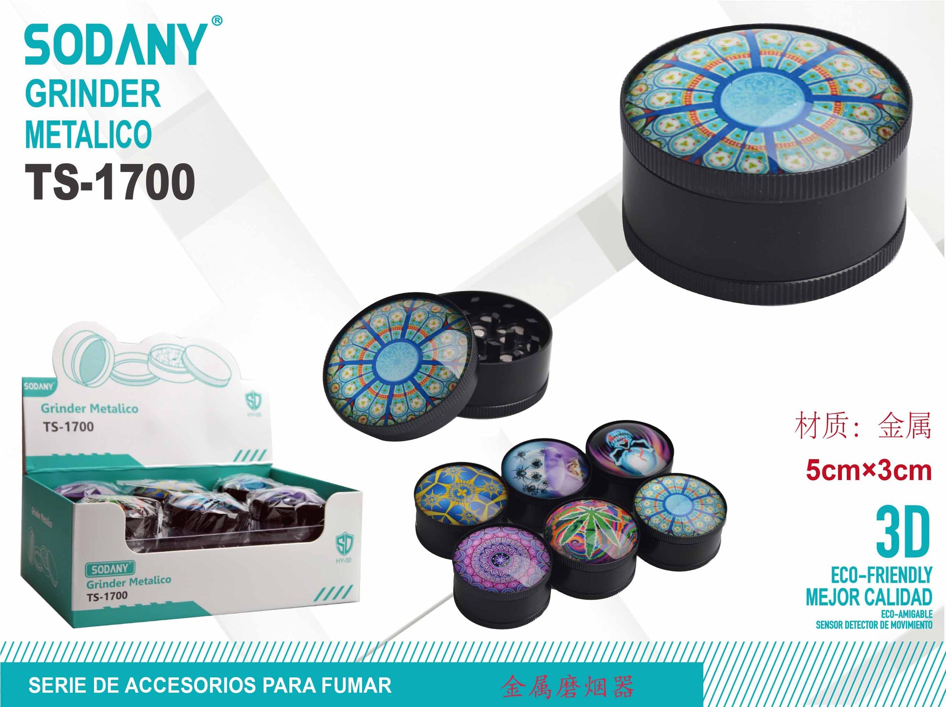 El Grinder Metálico Sodany TS-1700 es un elegante y funcional accesorio de triturado, diseñado con un atractivo patrón cristalino. Fabricado en metal, este grinder ofrece durabilidad y un rendimiento superior, ideal para quienes buscan un grinder confiable y con un diseño único y llamativo.