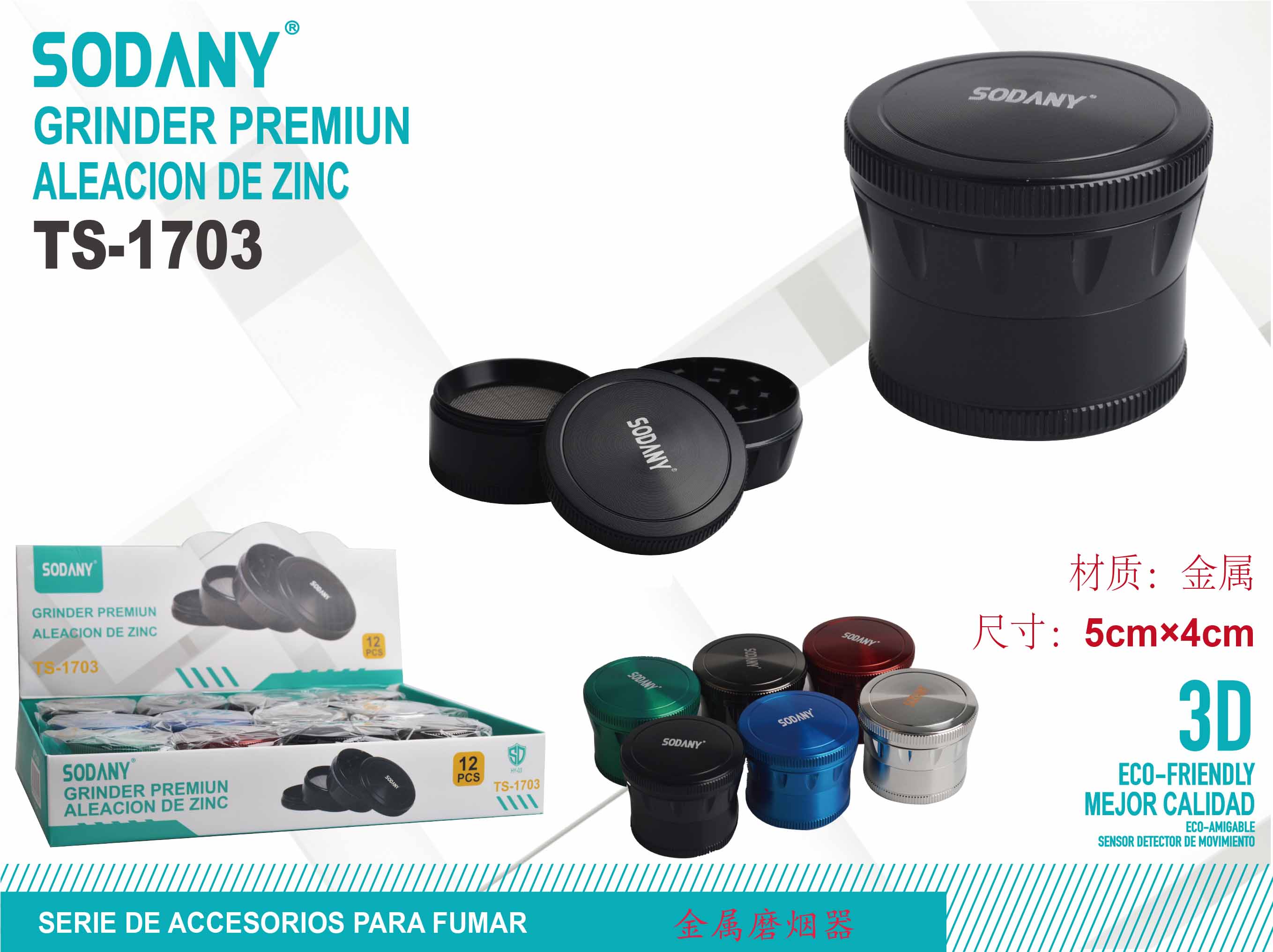 El Grinder Premium Sodany TS-1703 es una herramienta de alta calidad diseñada para ofrecer un triturado eficiente y uniforme. Hecho de aleación de zinc, este grinder combina durabilidad con un diseño elegante. Sus dimensiones lo hacen cómodo de usar y fácil de transportar, perfecto para quienes valoran tanto la calidad como la practicidad en sus accesorios para fumar.