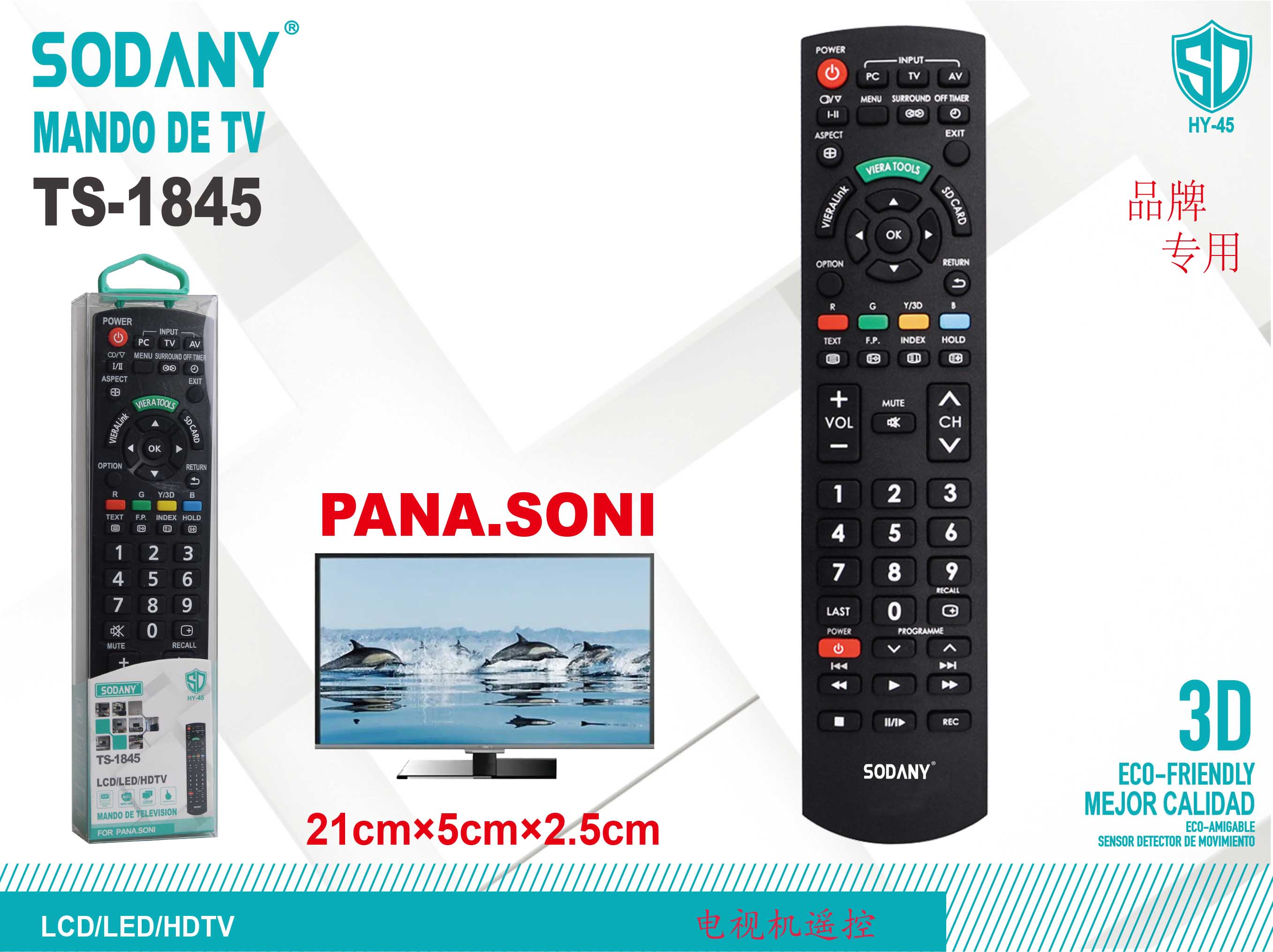 El mando de TV Sodany TS-1845 es un control remoto universal diseñado específicamente para televisores de la marca Panasonic, abarcando modelos LCD, LED y HDTV. Este mando a distancia es una opción confiable para aquellos que buscan un control versátil y fácil de usar para sus televisores Panasonic y Sony.