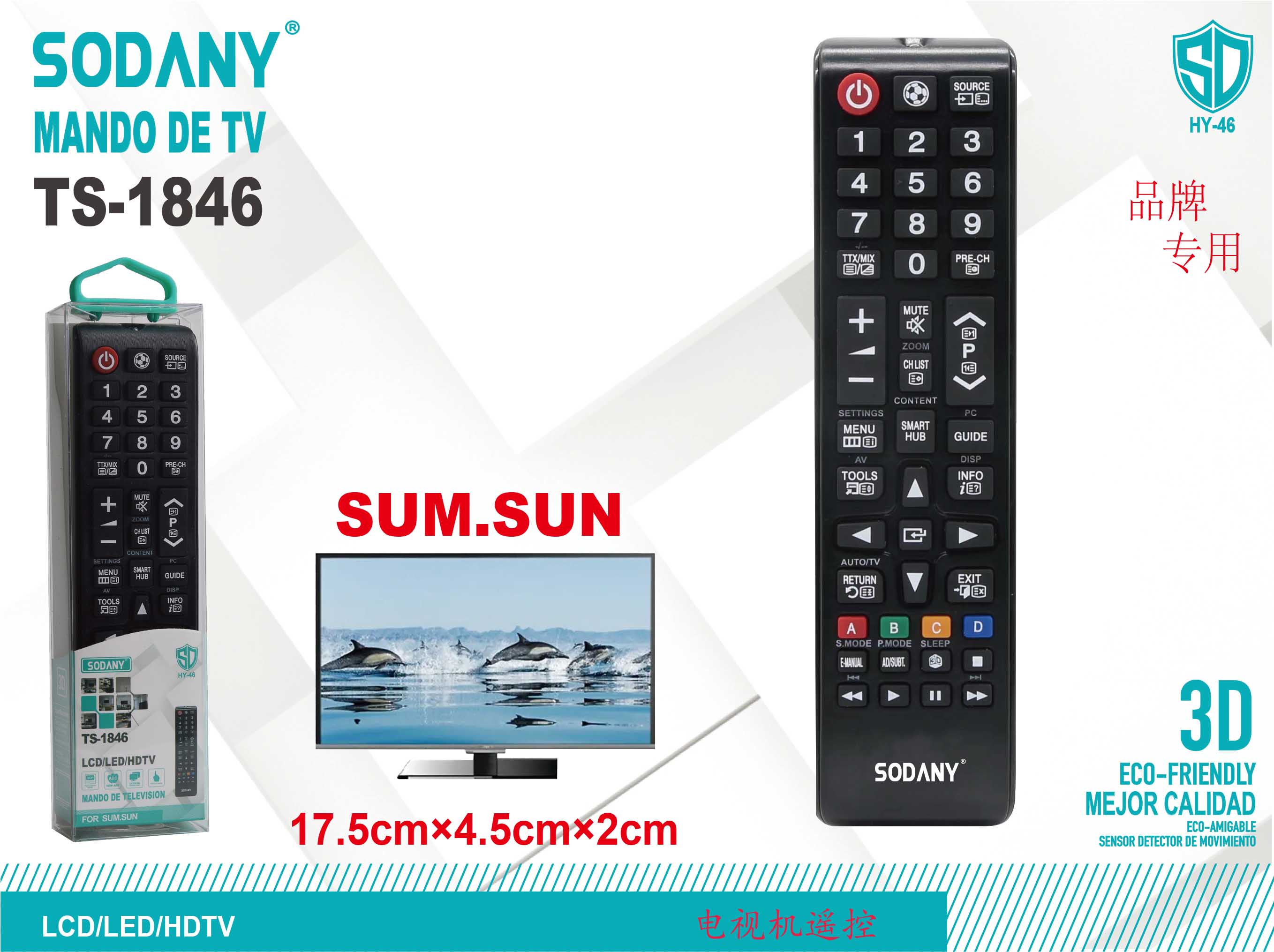 El mando de TV universal Sodany TS-1846 está diseñado para ofrecer un control completo y eficiente de televisores LCD, LED y HDTV, siendo compatible con una amplia gama de marcas y modelos, especialmente aquellos bajo la marca SUM.SUN.