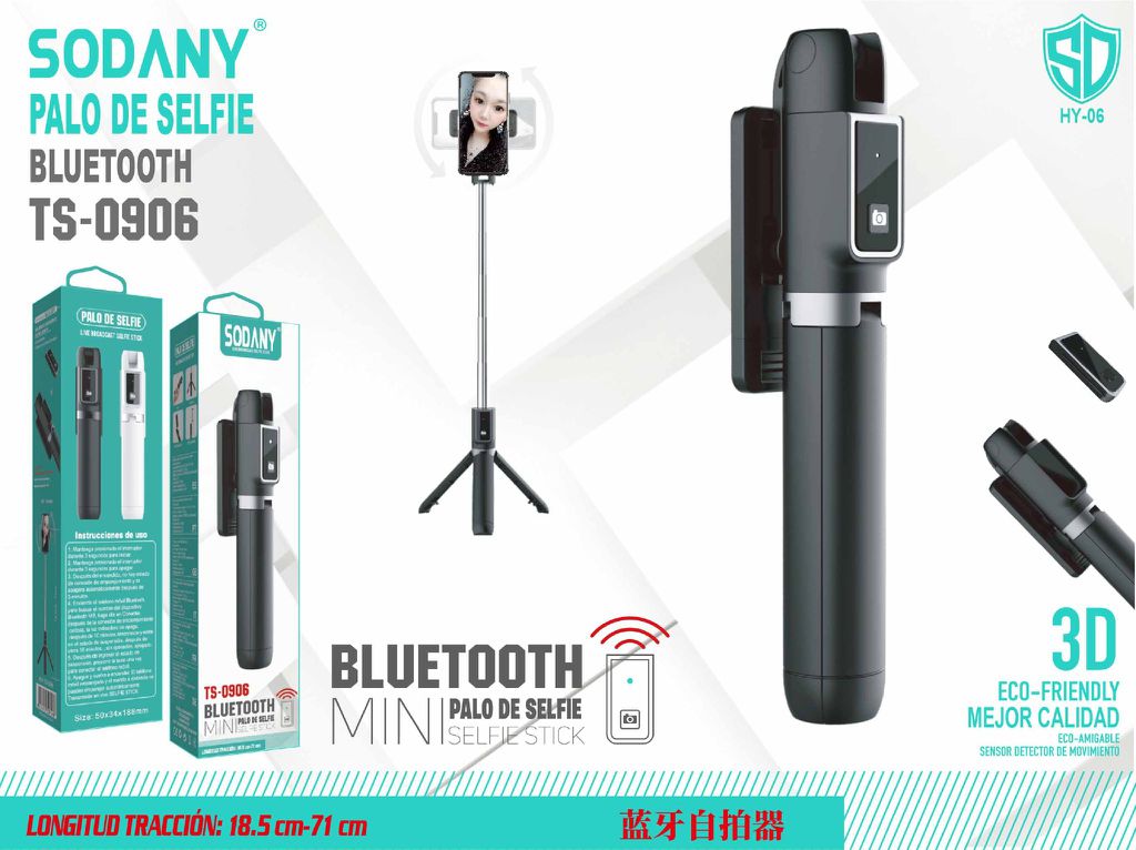 El Palo de Selfie Sodany TS-0906 con Bluetooth es la herramienta perfecta para capturar fotos y videos de alta calidad desde cualquier ángulo. Su elegante diseño en color negro y su capacidad de extenderse hasta 71 cm lo hacen ideal para selfies, videos y transmisión en vivo. Además, incluye un trípode integrado para mayor estabilidad y control.