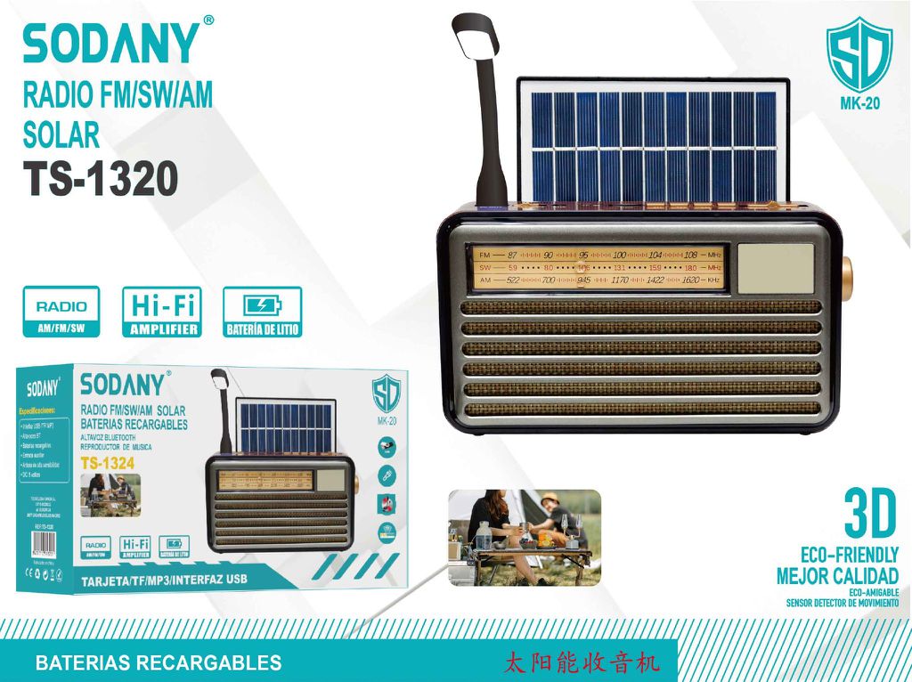 La radio Sodany TS-1320 es una radio multifuncional equipada con paneles solares para asegurar que siempre tengas acceso a tu música o estaciones de radio favoritas, incluso en entornos sin acceso a energía eléctrica. Este dispositivo combina tecnología clásica con energía renovable, siendo ideal para actividades al aire libre, emergencias o simplemente para disfrutar de una experiencia de radio sostenible.