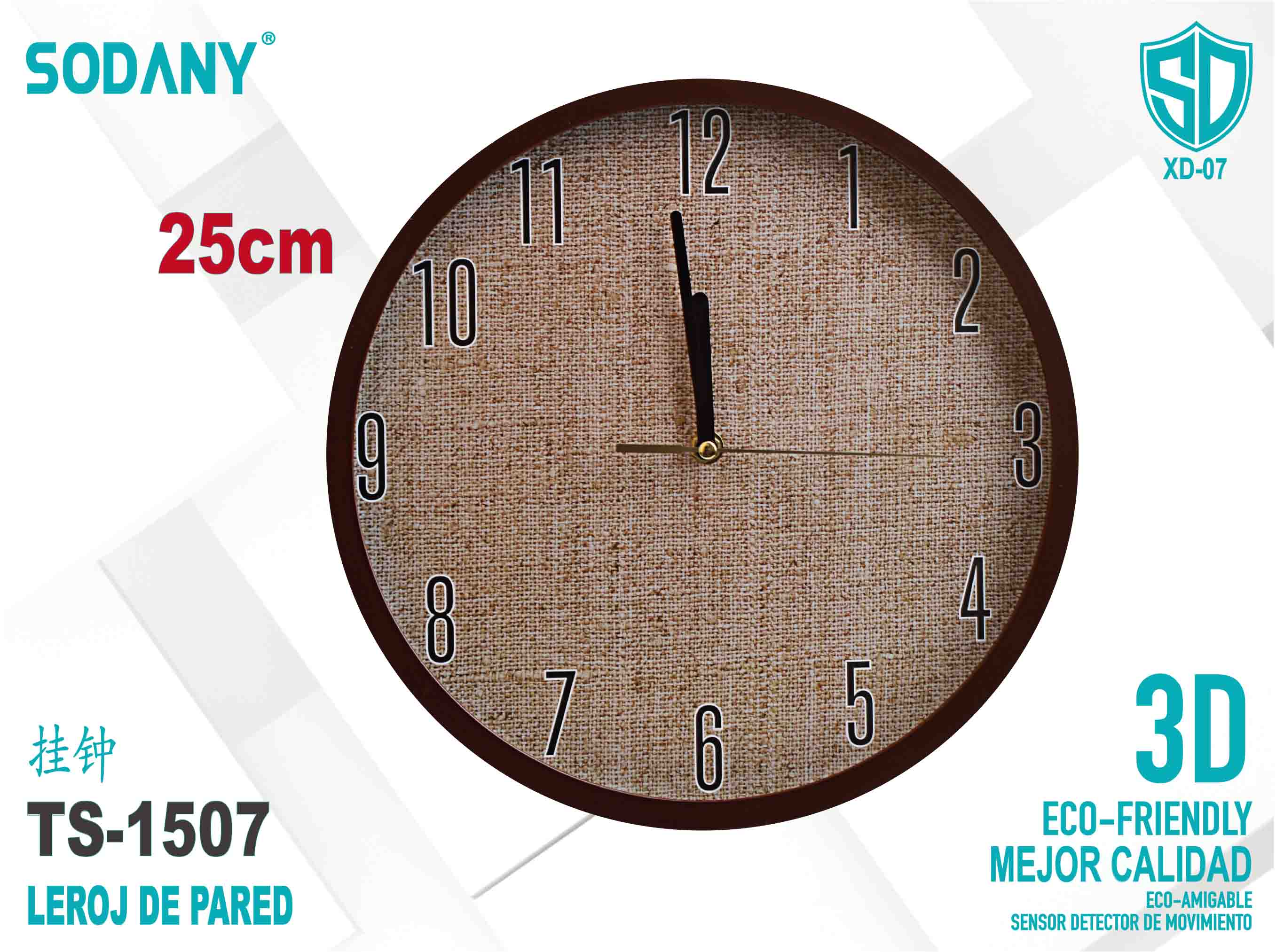 El reloj de pared Sodany TS-1507 se destaca por su diseño elegante con una textura de tela en el fondo, que añade un toque rústico y cálido a cualquier espacio. Ideal para interiores que buscan una combinación de modernidad con un estilo natural, este reloj es más que una herramienta para ver la hora; es un elemento decorativo que realza el ambiente de la habitación.