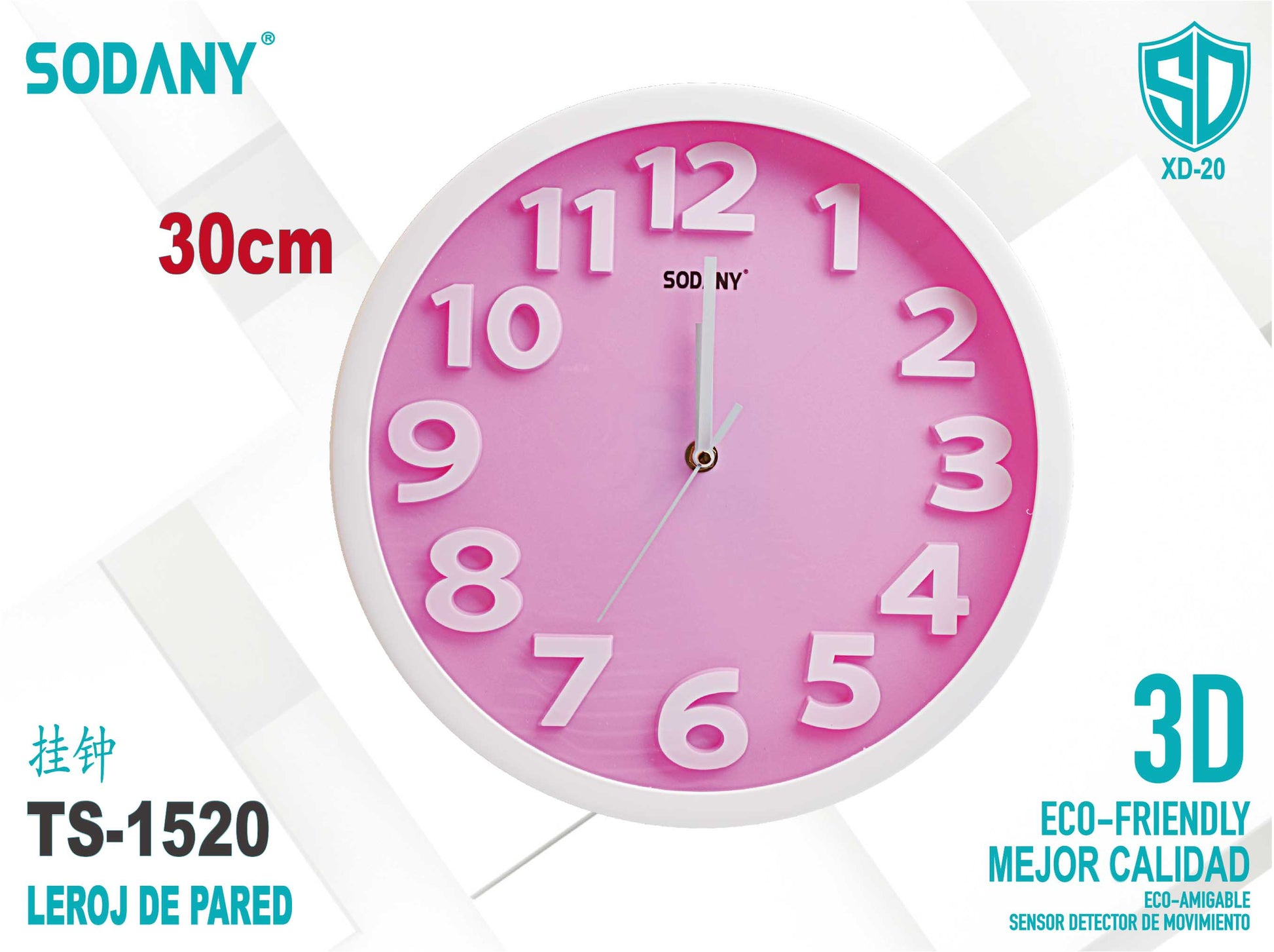 Este elegante reloj de pared Sodany TS-1520 en un llamativo color rosa, con números en relieve 3D, es una opción ideal para quienes buscan añadir un toque de color y estilo a su hogar. Su diseño moderno y funcional lo hace perfecto para cualquier estancia, ya sea la sala de estar, la cocina, o el dormitorio.
