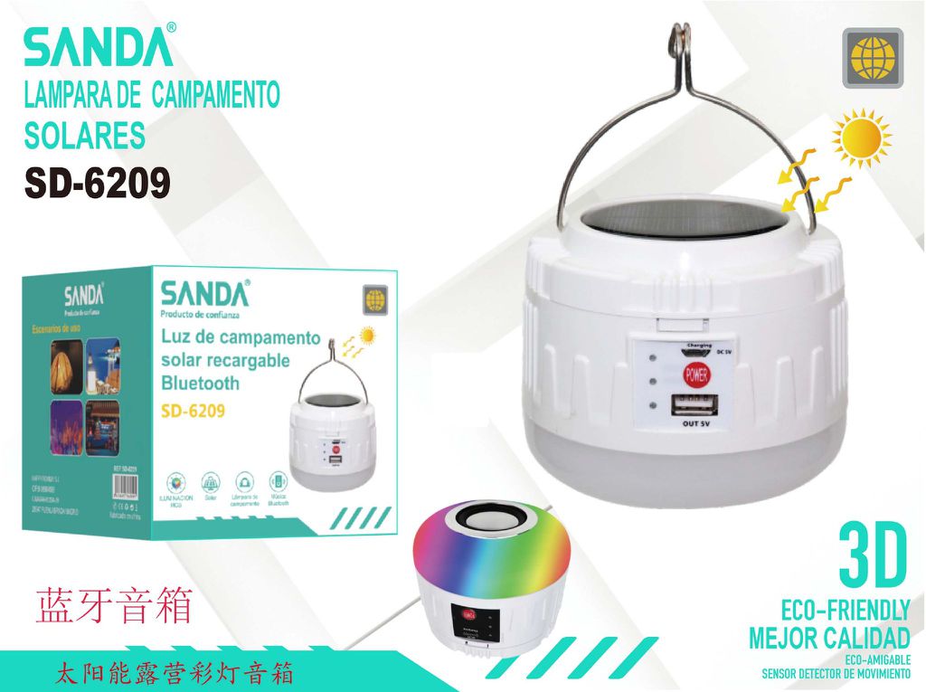 La lámpara de campamento solar SANDA SD-6209 es un dispositivo multifuncional diseñado para mejorar tu experiencia al aire libre. Combina una lámpara LED recargable con un altavoz Bluetooth integrado, proporcionando iluminación y entretenimiento en un solo producto. Ideal para acampadas, fiestas al aire libre, o cualquier evento donde necesites luz y música.