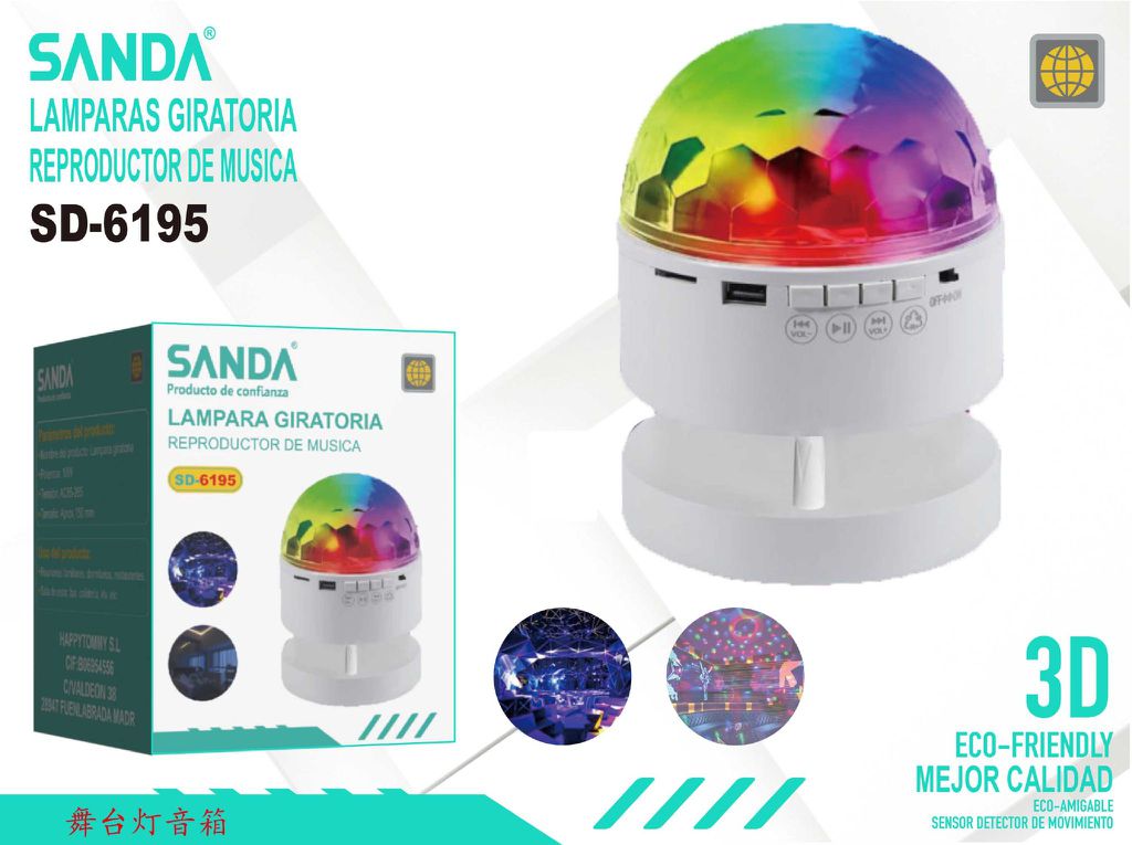 La lámpara giratoria SANDA SD-6195 es un reproductor de música multifuncional que ofrece una espectacular experiencia audiovisual. Combina una lámpara LED giratoria con un altavoz integrado, lo que la convierte en el complemento ideal para animar fiestas, celebraciones, o cualquier ambiente que desees decorar con luz y sonido.