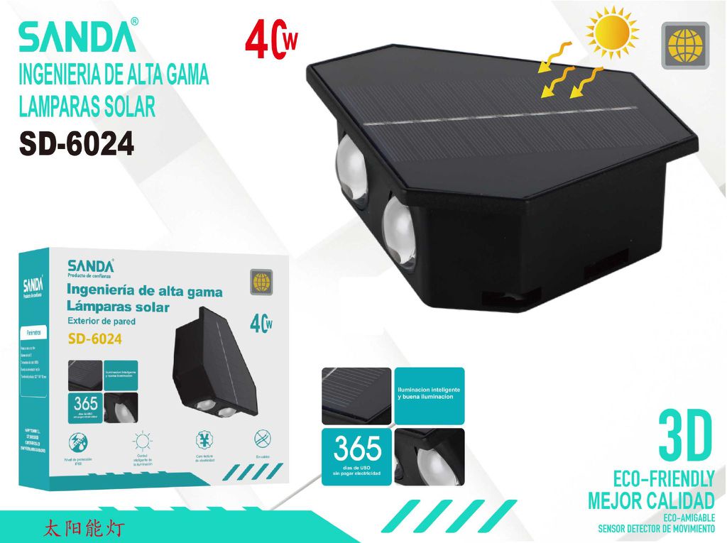 La Lámpara Solar SANDA SD-6024 es un dispositivo de alta gama, ideal para iluminar exteriores con eficiencia y sostenibilidad. Con una potencia de 4W y un diseño de doble foco, proporciona una iluminación óptima para áreas amplias. Gracias a su panel solar, esta lámpara captura la energía del sol durante el día y la almacena para ofrecer una luz potente y duradera durante la noche. Además, su sistema inteligente de sensor de movimiento asegura que la luz solo se encienda cuando se detecte actividad, ayudando a ahorrar energía y prolongar la vida útil de la batería.