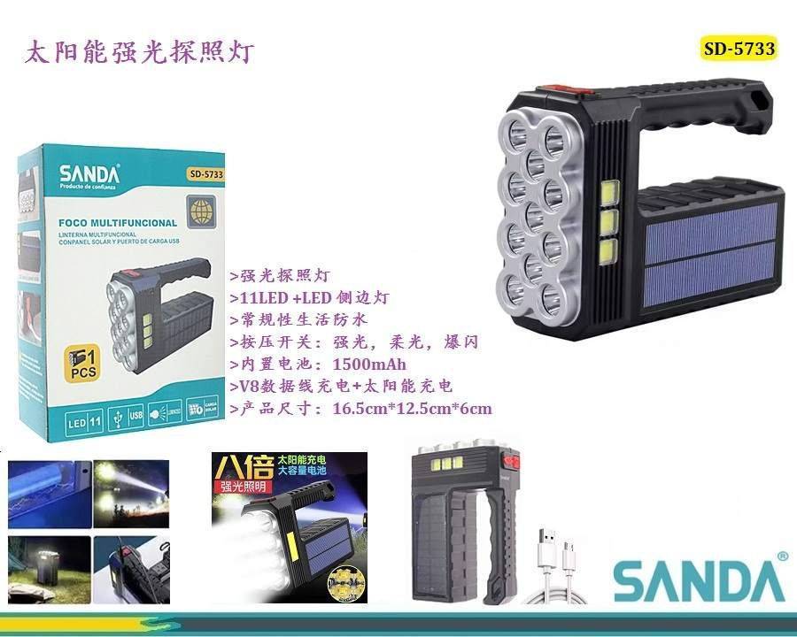 La Linterna Solar SD-5733 de SANDA ofrece una potente iluminación gracias a sus 11 LEDs y tecnología de carga solar. Diseñada para condiciones extremas, esta linterna multifuncional es perfecta para actividades al aire libre, emergencias o trabajos nocturnos. Su estructura resistente al agua y su capacidad para cargarse mediante energía solar o por USB la convierten en una opción confiable y sostenible.
